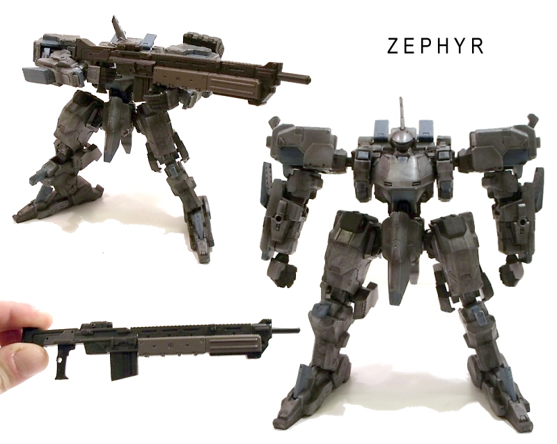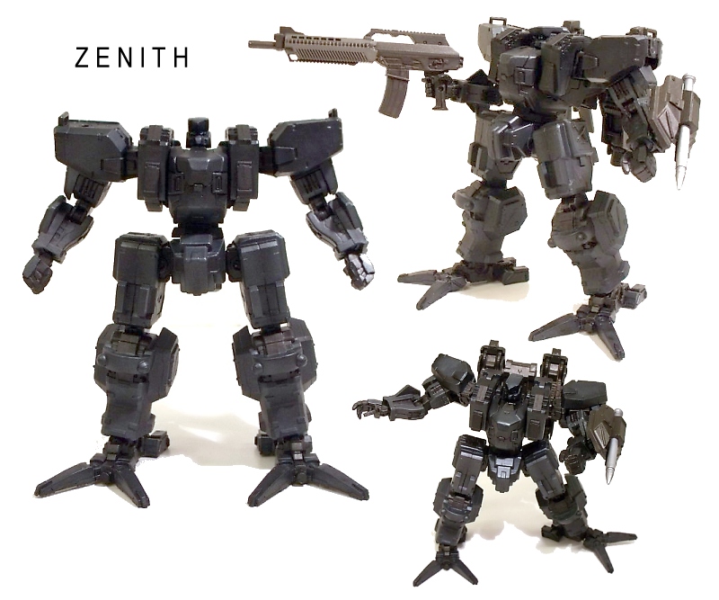 PAINT: Paint-wise, each wanzer strides into battle with its own color scheme. Another reason I like the Enyo so much is its very militant olive green paint apps. Darker shades of greens and browns add to this "real world" military vibe. The Zenith struts its stuff in shades of cool metallic blue while the Zephyr dons baby blue and silver. Overall, some amazing paint apps and color choices, each mech brought to life with loads of subtle shading and weathering.