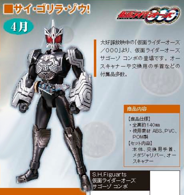 The currrent Kamen Rider OOO series has gained tremendous popularity. The SHFiguarts SaGohZo Combo will feature interchangeable claws and hand parts, as well as OOO's scanner and a full array of weapon accessories. SRP of $38.99.