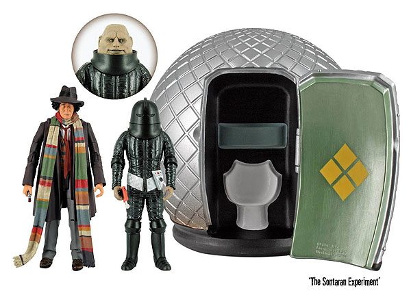 In this gift set, Underground Toys' presents the Classic Sontaran: Field-Major Styre (with helmet and gun) and his iconic Sontaran space ship along with the Fourth Doctor in duffle coat, hat and Sonic Screwdriver.