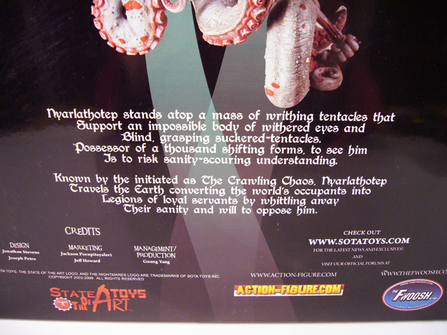 Nyarlathotep comes in an appropriately massive box. Fully 22 inches tall (and 15x12 around), this thing is huge. The design is understated and sophisticated, with simple backgrounds and large product images on each side. The front panel has a “beauty” shot of the entity’s upper body along with its name and the SOTA logo in front of a muddled black and green background that continues around the box.