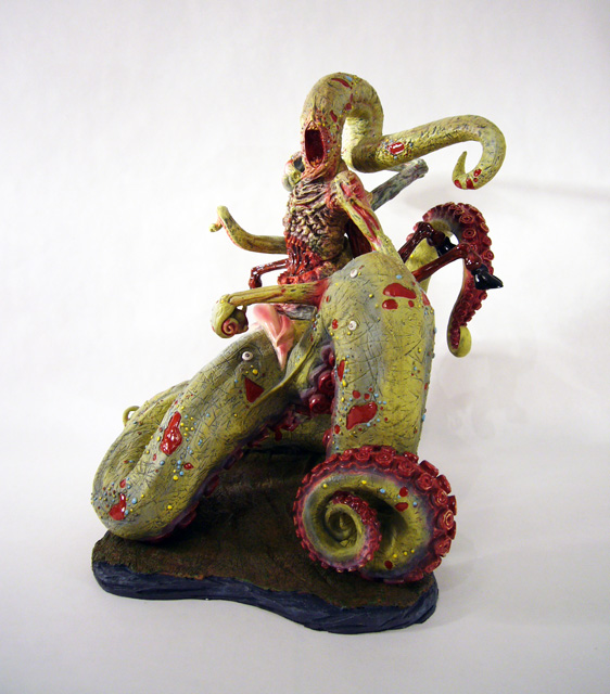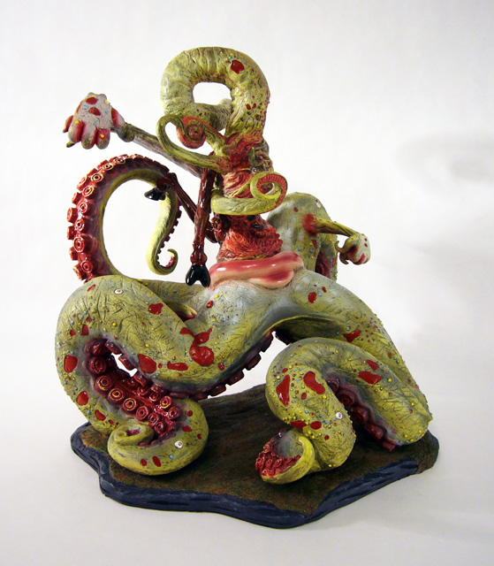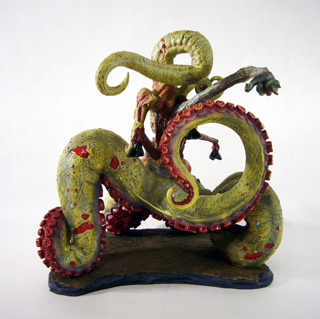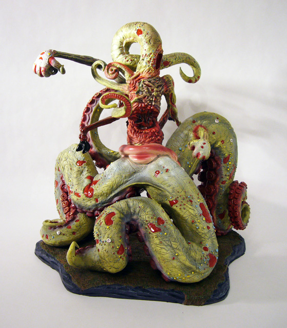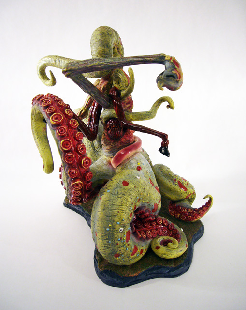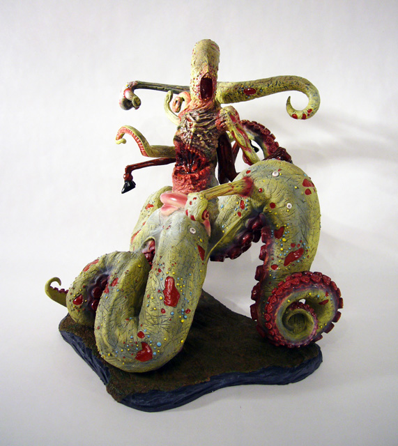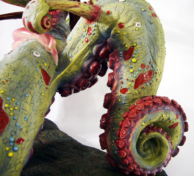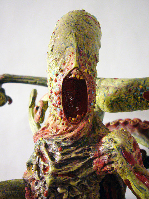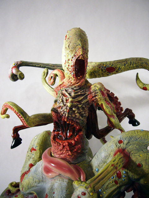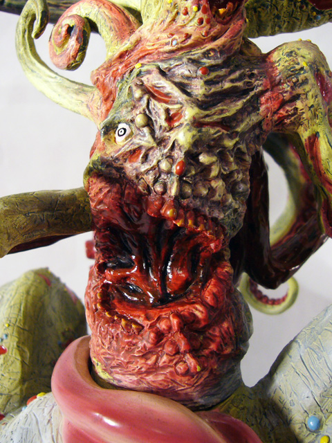 The central column of flesh looks like a mass of scar tissue with broken teeth surrounding a missing gobbet of flesh. Around the back is another fleshy, toothsome mouth. The various tentacle limbs are differently textured as well, from the smooth skinned goat legs to the rippling octopus tentacles.