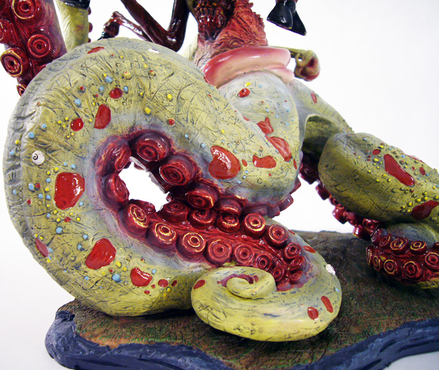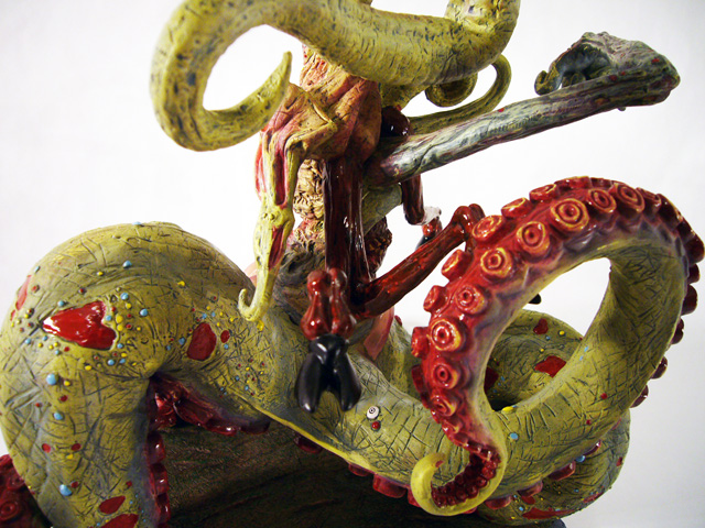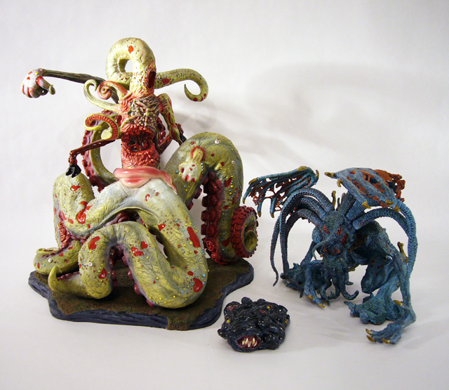 It’s quite difficult to describe Nyarlathotep. The god’s lower body consists of four massive tentacles equipped with giant octopus-like suckers. Growing upward from the confluence of those tentacles is what could be called its main body, essentially another tentacle that’s devoid of suckers. Scarred, burnt, and malformed, the central segment has several gaping mouth-like wounds. But that’s just the beginning of the story. Limbs sprout from Nyarlathotep at seemingly random locations, from the two huge “arms” protruding from one of the lower tentacles and the back of the main body to multiple smaller tentacles all over the main body and a trio of bloody, hoofed goat legs! That whole package is an enormous 12 inches tall and weighs 8 pounds.