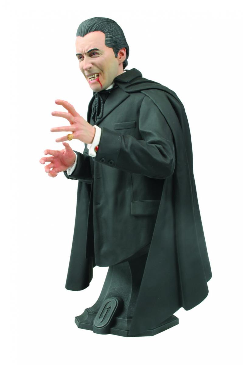 Officially-licensed, the series of sculptures will launch with horror legend Christopher Lee as Count Dracula, a role he played in seven vampire classics from Hammer Films. This detailed polystone maxi-bust stands 8" tall, 5" wide across the cape (6" from outstretched left hand to right shoulder) and 5" deep.