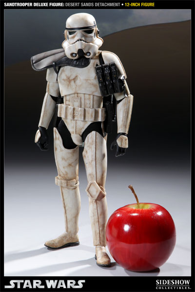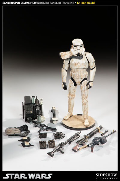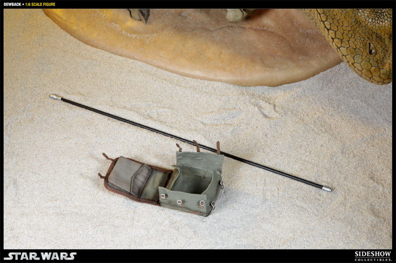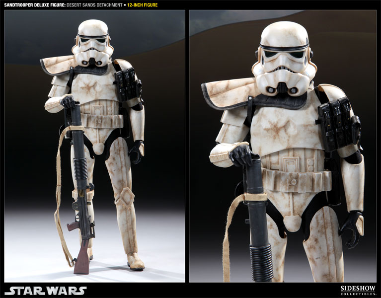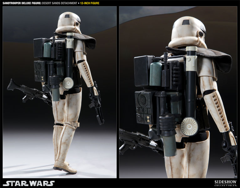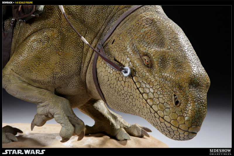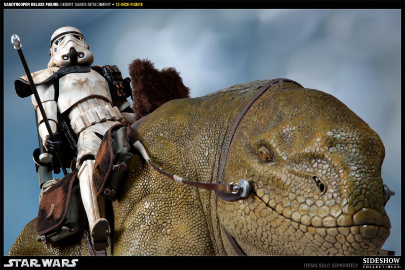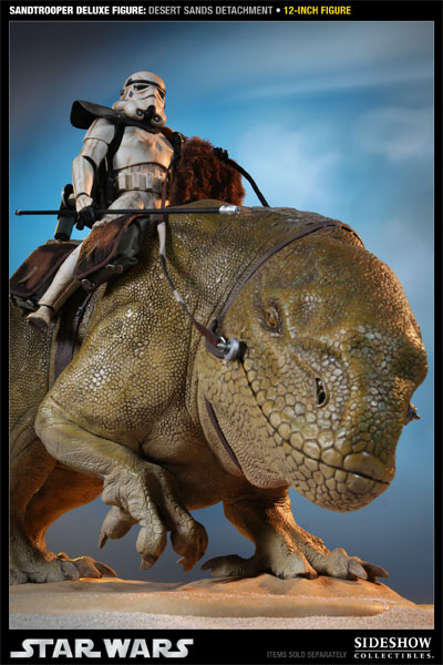 Sideshow provides a look at their latest 1:6th scale Star Wars figures: a new deluxe Sandtrooper "Desert Sands Detachment" and a massive Dewback for him to ride. Pre-orders for both figures begin Thursday, May 26th.