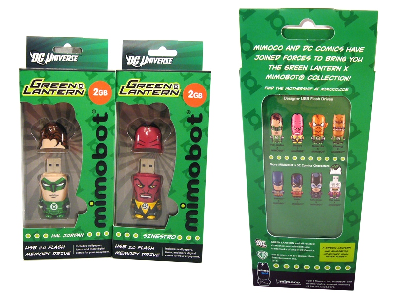 The Mimoco partnership with DC Comics continues with four all new MIMOBOT USB flash drives. Their initial collection brought you the heroes and villains of Gotham City with the Batman x MIMOBOT set (check out our review HERE). Now, the next group of characters to be transformed into MIMOBOTs is none other than the Green Lantern Corps and its enemy! Just in time to coincide with the release of the live action feature film as well as the animated Emerald Knights movie (read our review of that HERE) comes the Green Lantern x MIMOBOT USB Flash Drive Collection headlined by Hal Jordan and Sinestro (not pictured here are Kilowog and Tomar-Re).