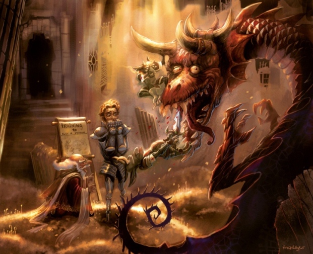 Next comes "Fantasy." A vivid collection of everything from settings and scenery to characters and battles are included here, giving readers a great variety. The next section, "Editorial Illustration" provides readers with a look at pieces which tell a story in the context of a publication (be it magazine, book, or newspaper). Be it comic art, humorous, adventurous, or somber, each piece here visually connects with viewers and relays a message or story. The next section is specifically "Humorous" and includes a variety of funny pieces which are sure to bring a smile (or sarcastic smirk) to one's face. Be it of flying pigs, a lute playing donkey, a wild grizzly bear with teddy bears, or a the "Master" level work featuring a warrior training a dragon (below), each hilariously shows an interesting character or situation.
