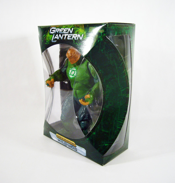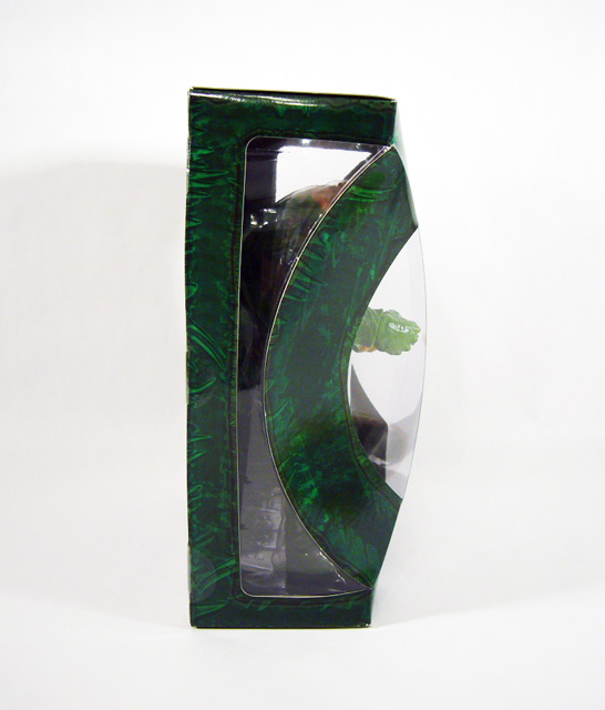 When I reviewed Green Man, I thought he was big. But Kilowog blows him out of the water. You can see from how he’s packaged – crouched way down – that he’s a big guy who couldn’t fit in the box if he were standing. Out of the box Kilowog is over 9 inches tall (don’t believe those who are re-printing that “8 inch” height), head and shoulders above even Green Man! His look is purely film-inspired with the wrinkled face, hunched head, massive shoulders, elephant-like skin, and huge hands and three-toed feet.