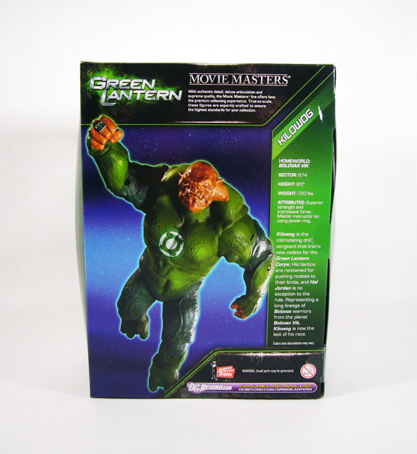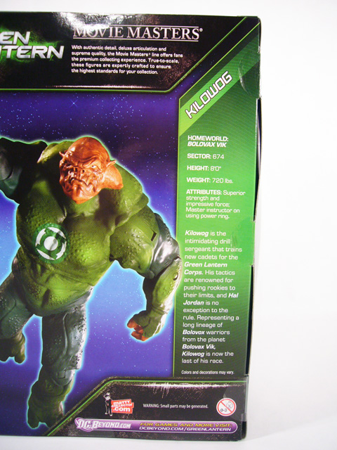 Like the Mattycollector exclusive Green Man (see our review HERE) before him, Kilowog comes packaged in an oversized window box version of the Movie Masters bubble and card. Also like Green Man, the drill instructor comes packaged first in a sturdy outer box that has the figure’s name and the movie logo. Inside you’ll see all of the familiar green, with the bulky plastic outline reminiscent of the Green Lantern symbol with an insert of swirling green and black GL energy. Behind the figure is a huge GL symbol, further reinforcing the brand. The reverse panel of Kilowog’s box has the standard Movie Masters description along with a large image, brief bio, and statistical information on the huge poozer.