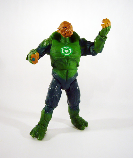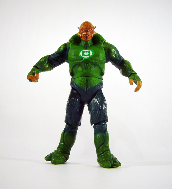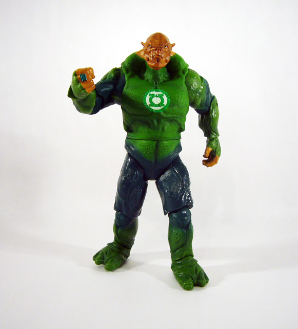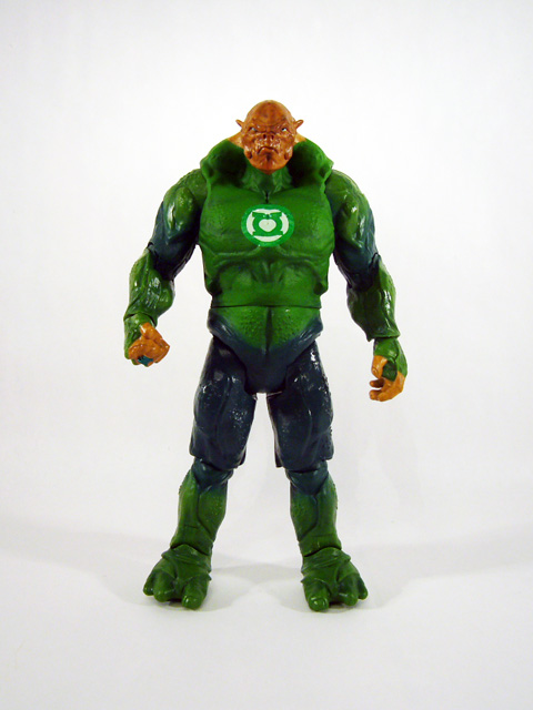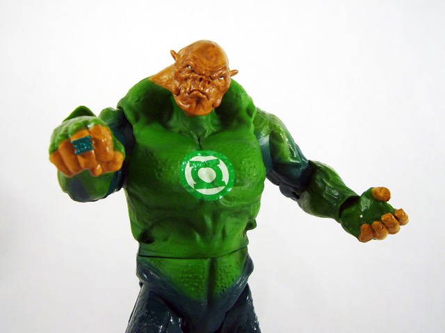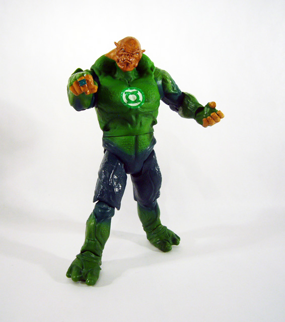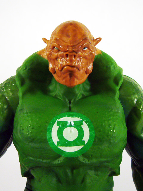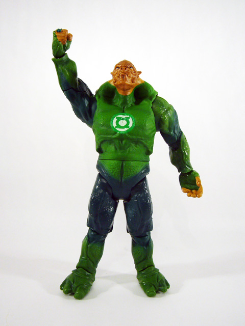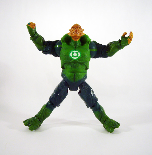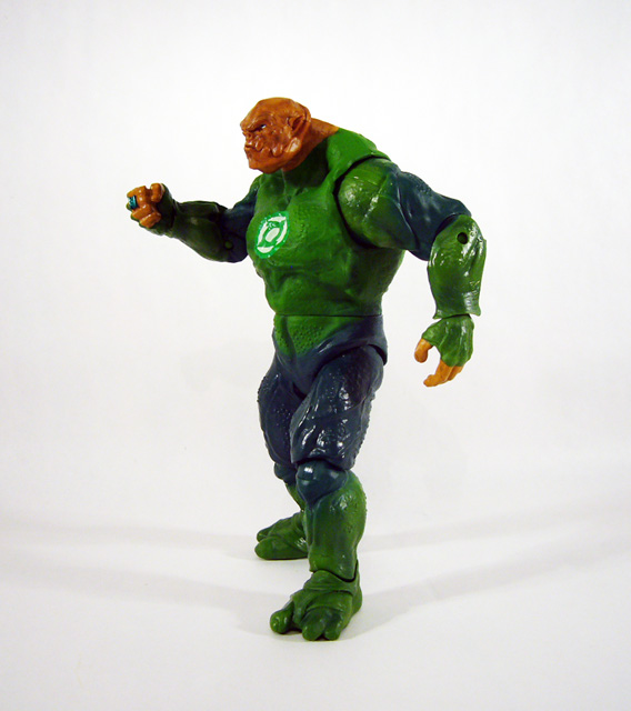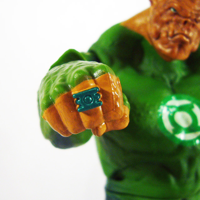 Also like Green Man, Kilowog benefits from a great sculpt that shows off his unique skin texture. Green Lanterns don’t really wear clothes; rather, their uniforms are essentially made of painted on energy. In Kilowog’s case this reveals his lumpy and bumpy hide. Other than the pattern of bumps across his body, the hefty Lantern has huge muscles and thick, fleshy folds in his skin that are most noticeable on his legs. True to his size, Kilowog has the largest Green Lantern ring of all the figures, and it looks great on his massive right fist (the left hand is sculpted open). As usual, on top of a really good body sculpt is one heck of a head sculpt. Kilowog’s unique head is rounded and bare on top with a face only a mother could love. Wrinkled and lumpy, it’s got plenty of character with a large brow ridge, sunken beady eyes, a porcine nose, and animal-like lip flaps. The only thing missing is the stubble!