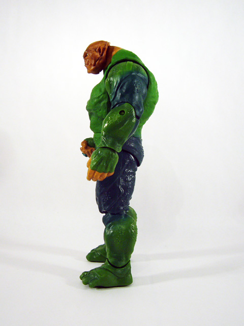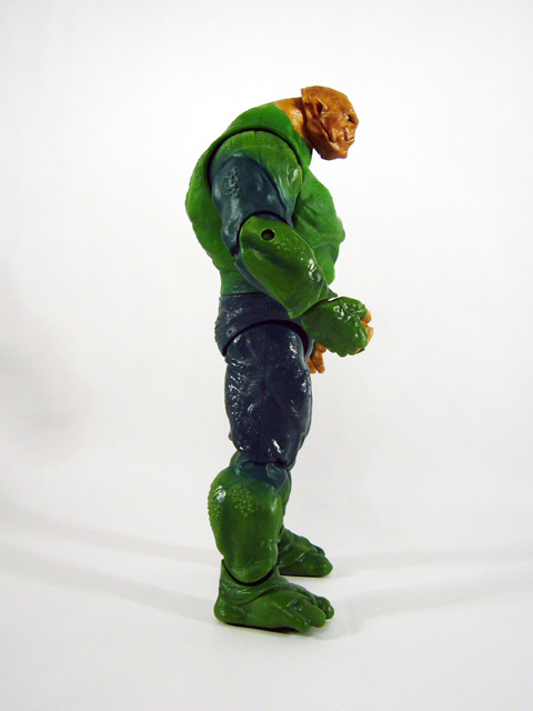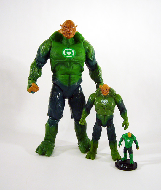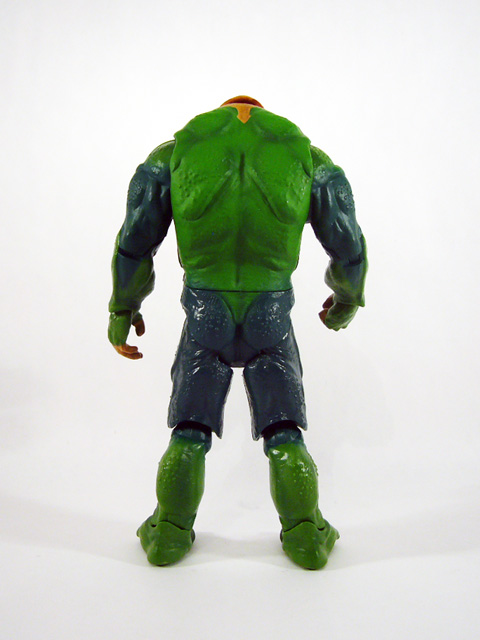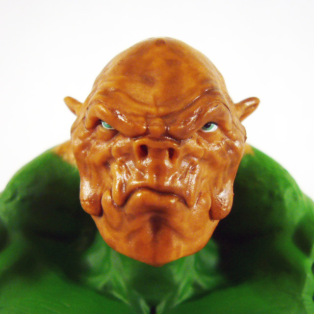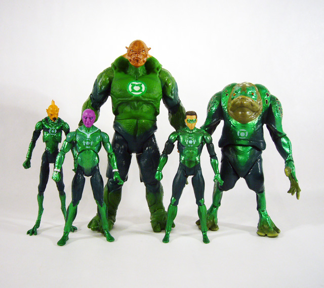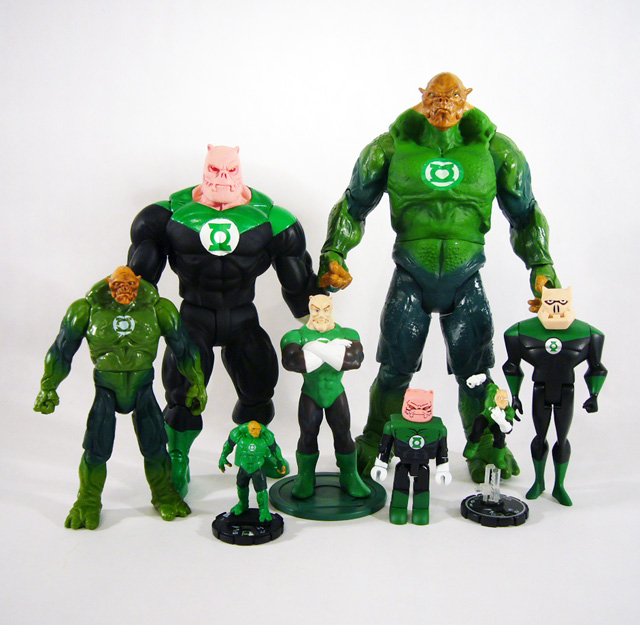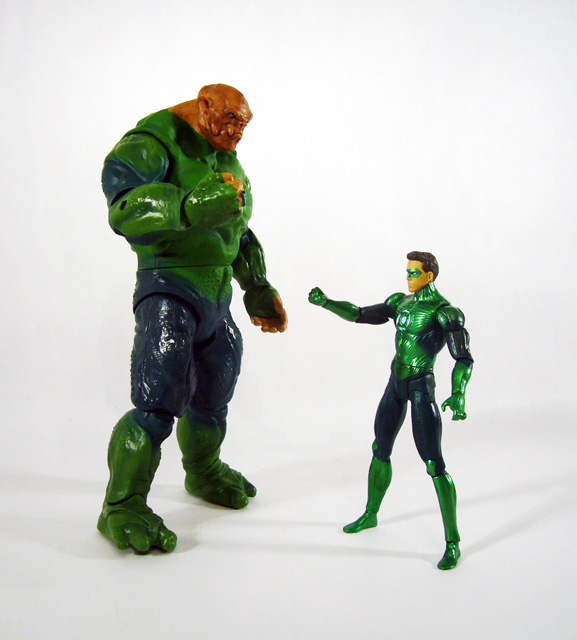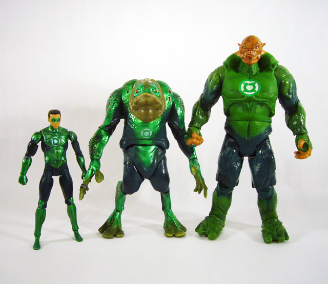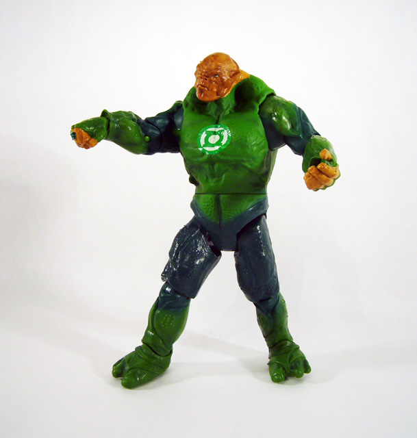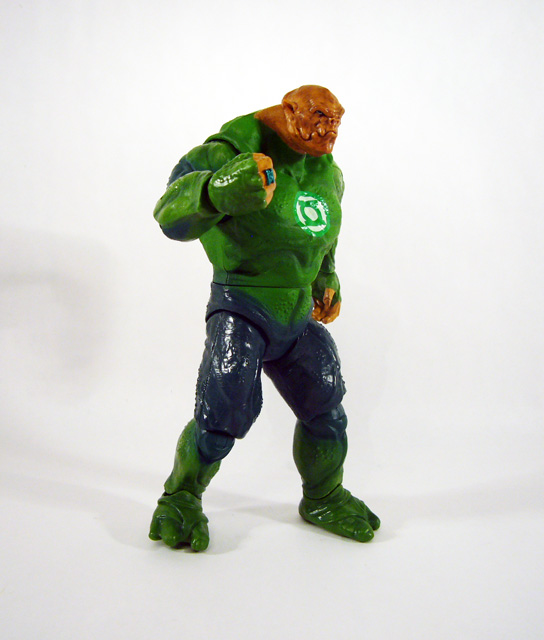 Also like Green Man, Kilowog benefits from a great sculpt that shows off his unique skin texture. Green Lanterns don’t really wear clothes; rather, their uniforms are essentially made of painted on energy. In Kilowog’s case this reveals his lumpy and bumpy hide. Other than the pattern of bumps across his body, the hefty Lantern has huge muscles and thick, fleshy folds in his skin that are most noticeable on his legs. True to his size, Kilowog has the largest Green Lantern ring of all the figures, and it looks great on his massive right fist (the left hand is sculpted open). As usual, on top of a really good body sculpt is one heck of a head sculpt. Kilowog’s unique head is rounded and bare on top with a face only a mother could love. Wrinkled and lumpy, it’s got plenty of character with a large brow ridge, sunken beady eyes, a porcine nose, and animal-like lip flaps. The only thing missing is the stubble!