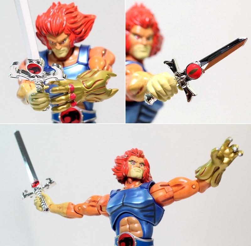 The accessories included with the SDCC release are slightly different than what you'll get when you buy the retail version, and to be perfectly honest, it is this very reason why I chose to buy the SDCC exclusive. First is the Sword of Omens, coming in both dagger and sword form. These weapons are produced in a reflective chrome material that gives it a metallic look. The basic figure release contains standard plastic looking sword and dagger. Also included is the Claw Shield gauntlet that can be swapped out with the removable left hand. The Claw Shield does have some extra detail since it's the exclusive but not much more. The dagger is able to be stored within the gauntlet, which is also given the option to hang at Lion-O's side.