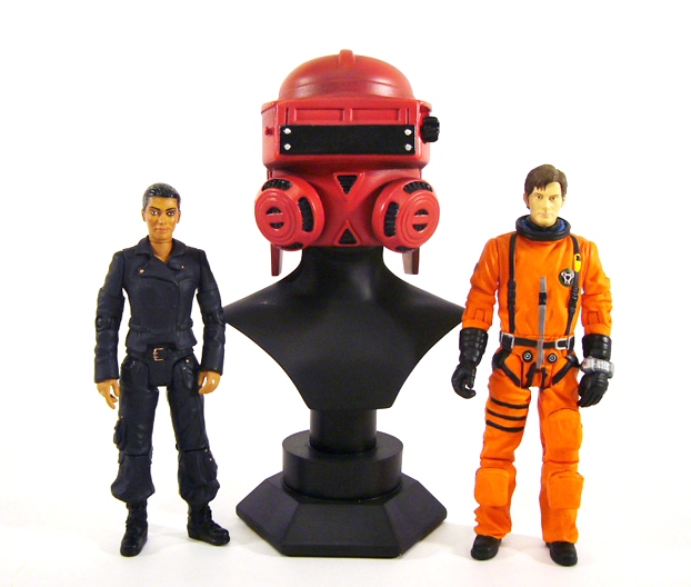 Weta’s miniature Industrial Welding Mask is a fantastic looking prop replica. Just taking it out of the box you can tell how much care and attention went into it. First off, it’s incredibly heavy for its size. At only three inches tall the cast metal mask by itself weighs nearly two pounds! Just like with Weta’s other miniature helmet lines (Lords of the Rings, etc.) the Doctor Who products come with model busts on which to mount them. The stand is about 6 ½ inches tall, a simple male head and torso made of black polystone on a hexagonal base. The bottom of the base has a bunch of information, a signature by sculptor David Tremont, and its individual number (out of 500). The mask fits snugly on the bust, and there’s built in padding so the top of the head doesn’t get scratched.