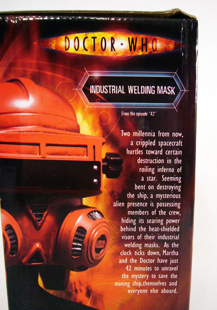 Weta’s miniature replica of the helmet comes to you in a very sleek box. Photos of the replica Welding Mask really pop over the black background and swirling red and yellow Doctor Who timestream patterns. The front panel is simple and sophisticated with a full frontal view of the helmet, its name in the bottom left corner, and logos for the show and Weta. One side panel shows the Mask’s profile, while the other has a close-up shot along with a description of the episode. The back of the box has an extreme close-up photo and rearview shot with a history of Doctor Who.