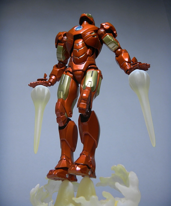 The Revoltech technology gives the Mark IV Iron Man the ability to be posed in several poses that other figure incarnations simply cannot achieve. This is the very first Iron Man action figure that can actually pull of the iconic Adi Granov ground punching pose thanks to its one-of-a-kind articulation. The Mark IV is incredibly versatile and can be placed in an extensive amount of dynamic poses but there is one minor drawback, the figure does not stand up on its own very well on its own. The only base the figure comes with is the ignition blast so unless you have the figure in a crouching pose, it tends to fall over easily because of its lightweightedness. It is disappointing that Kaiyodo did not include a display stand as they do with most of their Revoltech figures. This Iron Man figure would have been 10 times better if he would have included a tiny hole in the middle of his back that you could insert a transparent armature to for various action poses but I guess we will just have to make the best use out of the ignition stream base.