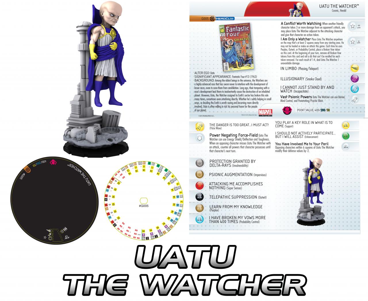 Totally separate from the “I Am Only a Watcher” dial is the 400/200 incarnation which is... something more. Starting at 400 gives Uatu the trait “A Conflict Worth Watching” that lets him move adjacent to an enemy who just dealt a friendly figure for 3 or more damage AND give it an action token. He also begins with 14 movement Phasing/Teleport, 9 attack Smoke Cloud, 2 damage Outwit, and 17 defense with the special “Power Negating Force-Field” that grants Energy Shield/Deflection and Toughness and counters all powers on an opposing figure that missed Uatu with an attack! The Watcher only gets tougher as he unveils the full extent of his power over the rest of his dial. His entire dial sports 14 Phasing/Teleport, and the rest of the starting stats stay constant for four clicks (with Outwit switching to Perplex after two) before things start to change. Click five sees Uatu trading 9 attack Smoke Cloud for 10 attack Incapacitate and upgrading to 3 damage Probability Control. Then he drops the Force-Field for Invulnerability as his defense hits 18, concurrent with some Support. Mid-dial the attack hits 11 with the special “Vast Psionic Powers” of Barrier, Mind Control, and Penetrating/Psychic Blast linked with 4 damage! Click number ten is the 200 point starting line, where Support gives way to Enhancement. Just a few clicks later Uatu gets his final upgrade with Pulse Wave, Impervious, and the special damage power “You Have Involved Me to Your Peril” that modifies the defense of opposing characters within 6 squares by -2! On top of all of that, the “Watcher’s” final click reaches its zenith with 12 attack, 19 defense, and 5 damage. Non-interference, indeed!