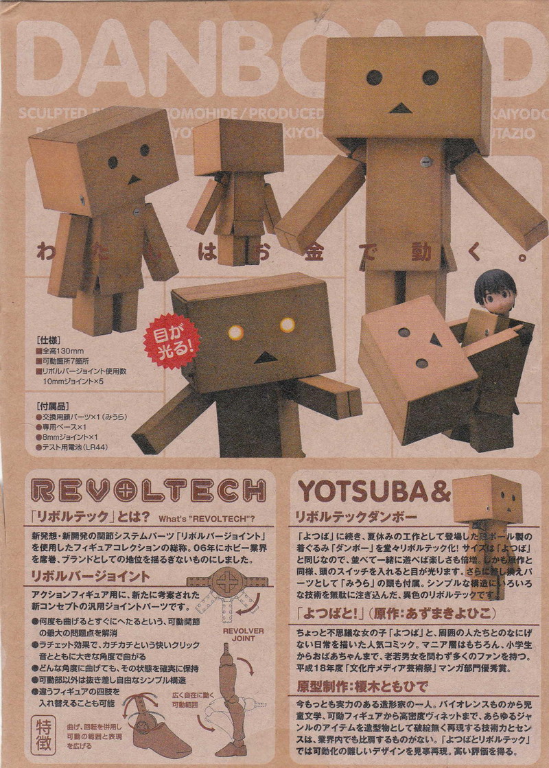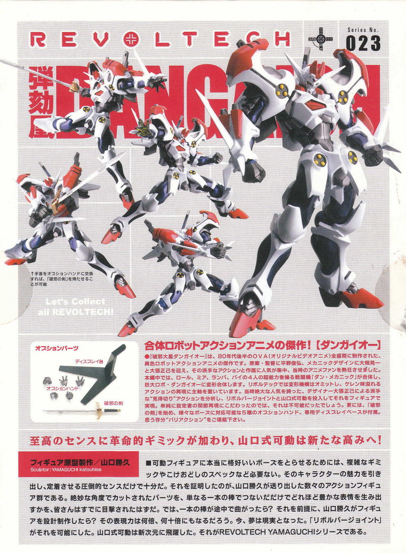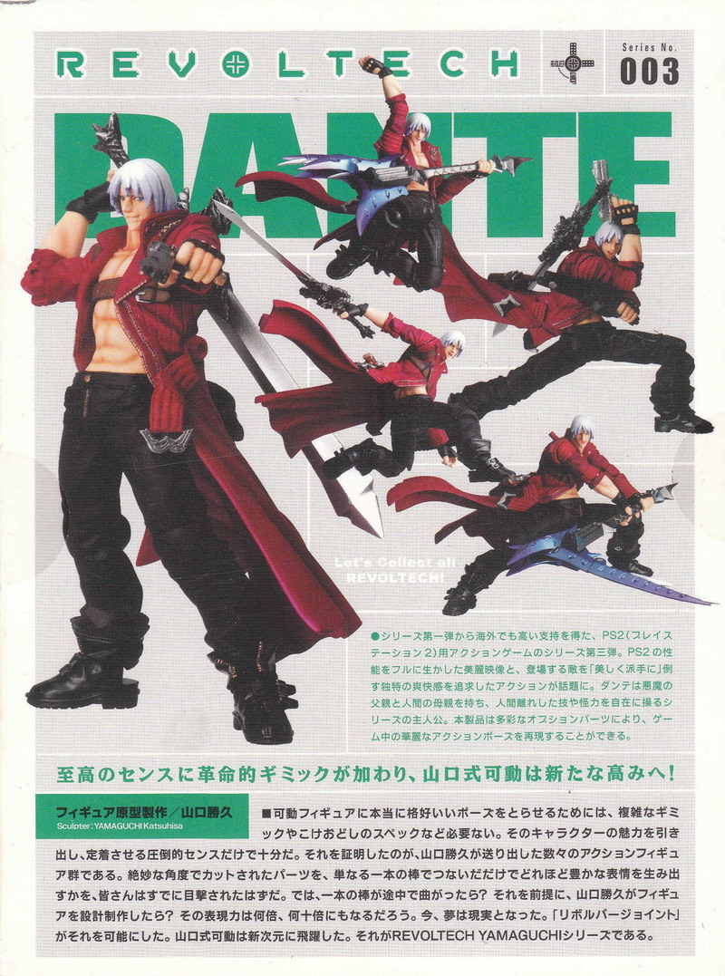 Since its introduction in May 2006 with the Super Robot Getter-1, Kaiyodo's Revoltech series has grown to feature over 100 characters from popular anime, manga, video games and more. Pictured here are only a small handful of the diverse figure offerings - from Revoltech's humble beginnings with the Devil May Cry's demon-slaying hero Dante to the Revoltech 2G's blocky oddball, Danboard.