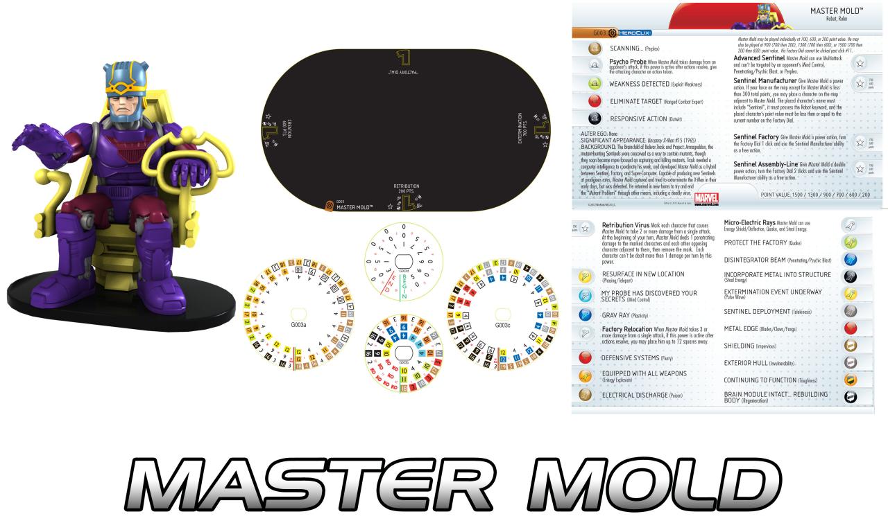 When played at the 200 point Retribution level Master Mold employs the “Retribution Virus” that marks figures that do 2 or more damage to it. At the start of the Sentinel’s player’s turn those with a mark and every enemy figure adjacent to them take 1 penetrating damage! Upgrading to Creation and Extermination we see the real purpose behind the robot: unleashing more Sentinels upon the world. The “Sentinel Manufacturer” Trait is the first to make mention of the figure’s fourth “Factory” dial. Master Mold can be given a power action when the rest of your force is under 300 points to bring into the game one figure with “Sentinel” in its name and the Robot keyword! This figure must have a point value equal to or less than the number showing on the Factory dial, which goes from 50 to 300. Production can be further increased via the next two Traits. “Sentinel Factory” uses a power action to turn the Factory dial one click and use Manfacturer as a free action, while “Sentinel Assembly-Line” does the same but with two clicks to the dial for the cost of a double power action (and no pushing damage thanks to Indomitable).