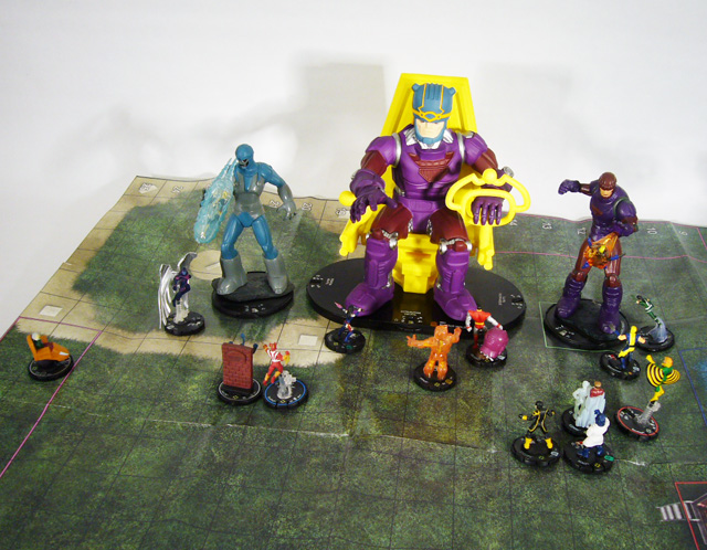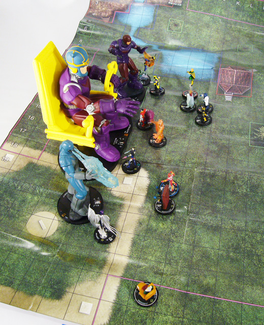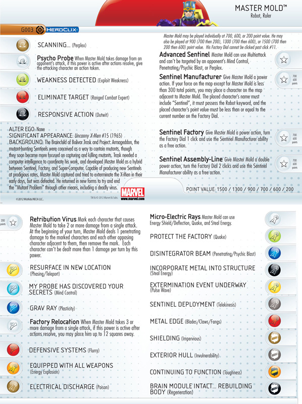 At its different starting point values Master Mold brings plenty of solid stats and effective powers. Extermination begins with 12 movement Phasing/Teleport, 12 attack Penetrating/Psychic Blast, 19 defense Impervious, and 5 damage with Perplex. After the initial burst of movement the robot’s speed drops to a 4 that stays stable until two final clicks of 6. Meanwhile, the movement track sees a succession of powers including Plasticity to keep foes engaged, Flurry to dish out more attacks, and the Special Power “Factory Relocation” that lets you place it up to 12 squares away if it’s showing after the figure takes 3 or more damage in a single attack. From the starting 12 attack the numbers bounce around between 12 and 10 until click eleven with two 9s, two 10s, and a 9 from there on out. Powers alternate between PsyBlast, Pulse Wave, and Telekinesis to move your Sentinel army, and late dial it also employs Blades/Claws/Fangs and a four click run of Steal Energy to regain health. Defensively Master Mold very slowly winds down from a 19 to a 16 with a fairly typical progression of Impervious (six clicks), Invulnerable, Toughness, and Regeneration; coupled with a full twenty clicks of life it’ll take a lot to bring down this Sentinel. Damage starts high with two clicks of 5 Perplex, then eight clicks of 4 with Outwit, Exploit Weakness, and Perplex, then the rest of the dial at 3 with more of the same powers.