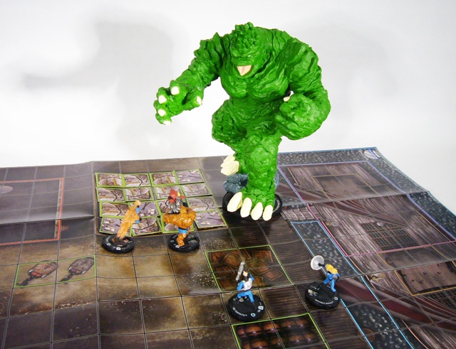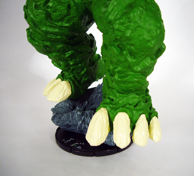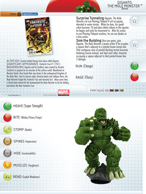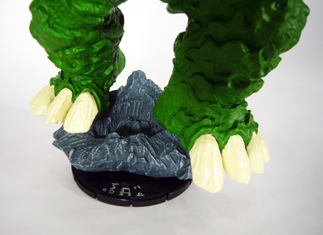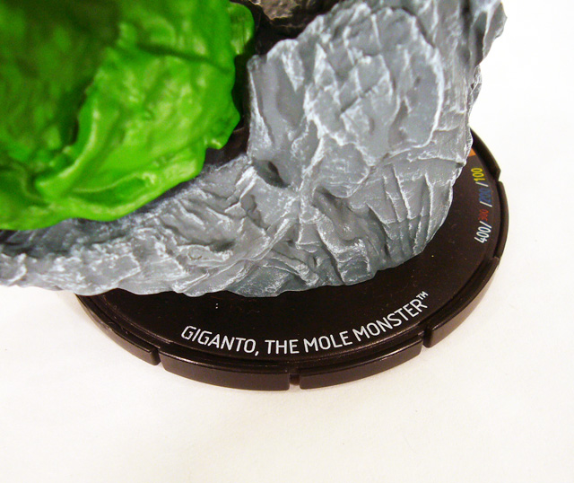 Like Uatu, Giganto stands upon a 2x2 square HeroClix base. However, while the Watcher is a diminutive figure only slightly larger than standard, the Mole Monster towers over the battlefield at a truly impressive 9 ¼ inches! In fact, while the 2x2 base is only 3 inches wide, Giganto’s feet span well over 5. Be careful when you move him during a game as he will very likely kick over the opposition. The Deviant-created beast is roughly humanoid with a lumpy body covered in thick armor-like skin that forms overlapping plates and spines. Its huge feet are tipped by four powerful claws while its five-fingered hands look like they could easily tunnel through the Earth. Giganto’s wide, monstrous face lacks intelligence but projects ferocity with deeply set eyes and a massive open mouth.