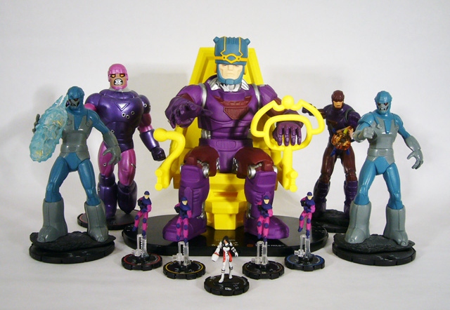 As a HeroClix figure, Master Mold has some really fun features. Like other colossals it has multiple starting point values so you can play it at different power levels. The three dials in its base are “Retribution” at 200 points, “Creation” at 600, and “Extermination” at 700. You can also play Master Mold at 900, 1300, and 1500 points by combining the dials as explained on its card. At all power levels the Sentinel has the colossal damage symbol, Indomitable, and a 10 range with two targets. The “Advanced Sentinel” Trait gives the robot Multiattack and immunity from Mind Control, Penetrating/Psychic Blast, and Perplex no matter what point value you start with, and it has further special Traits at each level of power and an additional fourth dial.
