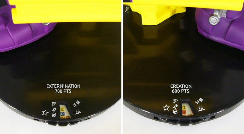 Creation at 600 points takes a slightly different approach with starting 12 movement Phasing/Teleport, 12 attack Energy Explosion, 18 defense Impervious, and 4 damage Perplex. After the first click it’s straight vanilla 4 movement until the final three clicks return to 12 with Phasing to get out of the fray. Attack values are very steady, declining to a 9 only on click 10, with the rest of the dial a mix of 9s and 10s. Three straight clicks of EE give way to three of Poison and then a long run of “Micro-Electric Rays” that give Master Mold Energy Shield/Deflection, Quake, and Steal Energy! At click twelve it’s back to EE for six clicks. While the defensive powers follow the usual trend, the numbers bounce back and forth between 18 and 17 all the way until click eighteen and the three final ones with 16. Damage drops to 3 at click seven and 2 at click 14 before returning to 3, with lots of Perplex, Exploit Weakness, and “Psycho Probe” that applies an action token to any enemy that dealt Master Mold damage in an attack if it appears when actions resolve! The 200 point Retribution dial keeps things interesting with starting 10 Phasing, 11 attack Quake, 18 defense Impervious, and 3 damage Ranged Combat Expert. Consistently sporting powers to use in melee and at range, this version of Master Mold alternates power sets with mid dial Mind Control + Energy Explosion then Plasticity + Penetrating/Psychic Blast, and finally Phasing + Steal Energy. Numbers are nice and consistent except for the by now expected 4 movement between starting and ending 10s.