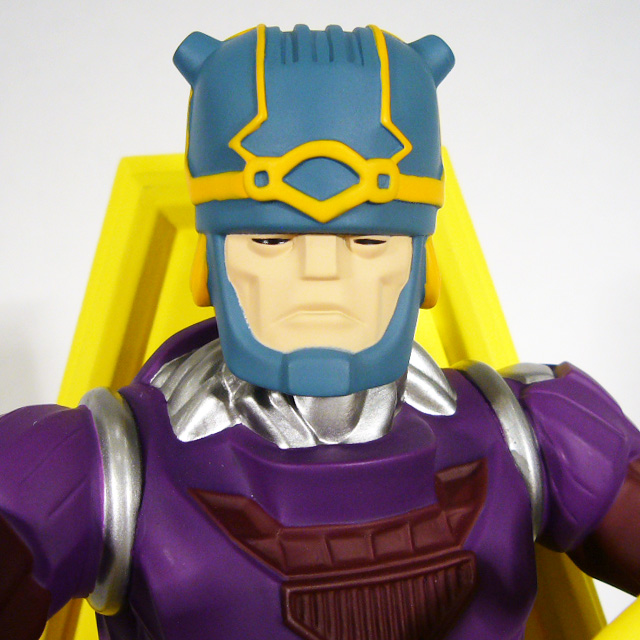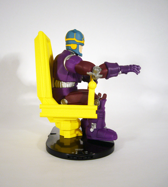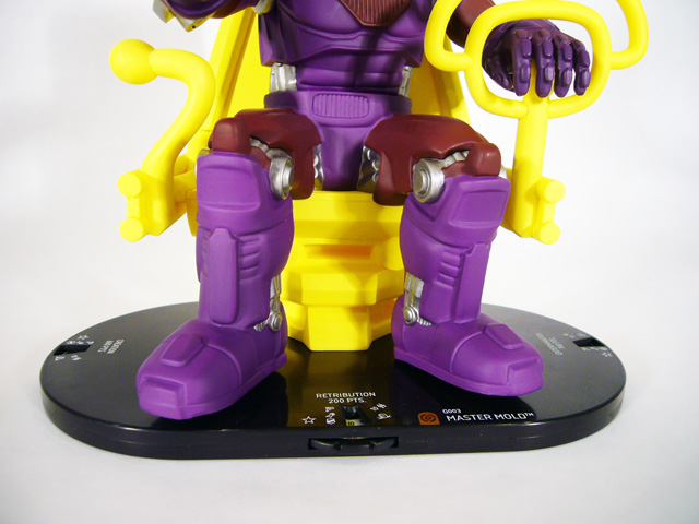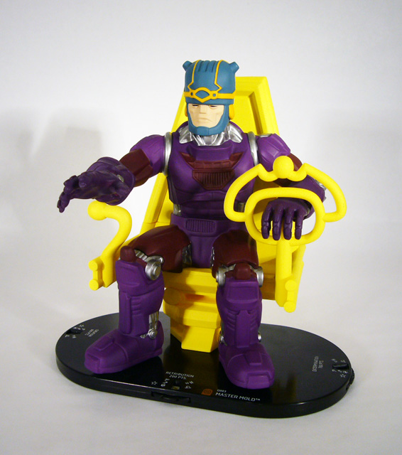 Like its overall design, Master Mold takes the basics of its color palette from the standard Sentinels and adds its own touches. Its armor is purple and burgundy, with bright silver appearing on the mechanical joints. The super-computer’s enlarged helmet (complete with “chin strap”) is blue with goldenrod piping, and its face is a very pale tan with black eyes. Master Mold’s monstrous chair is an all over dazzling yellow. It’s worth noting that this colossal has one point of articulation: its right hand has a joint at the wrist enabling you to turn it 360 degrees. It’s a cool addition that lets you play with the look of your Master Mold.