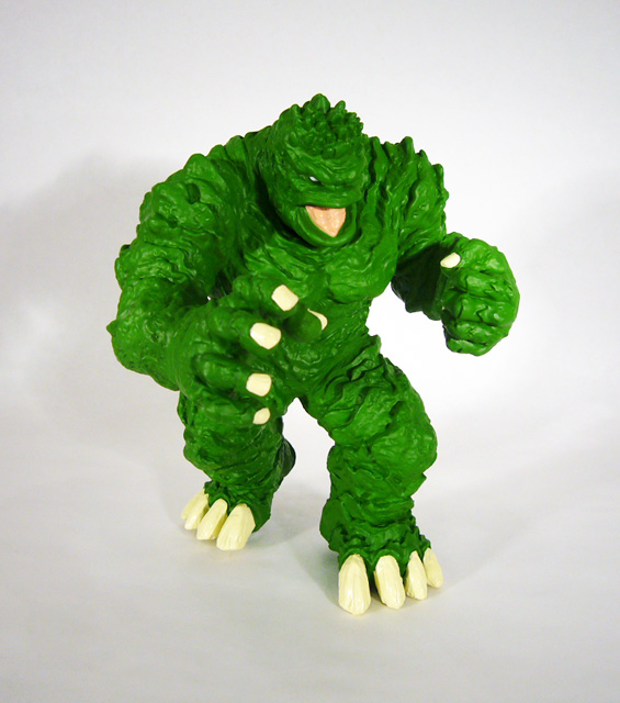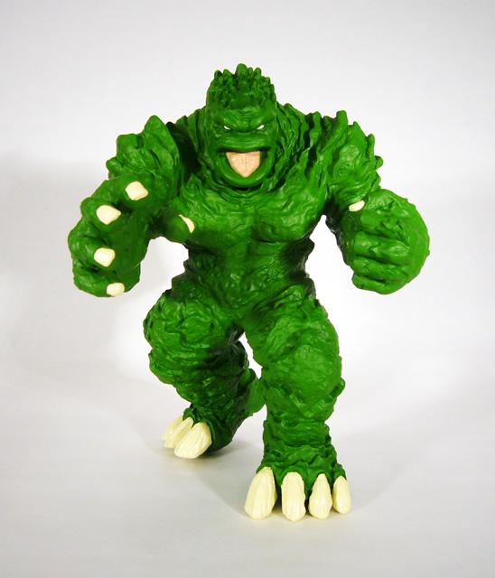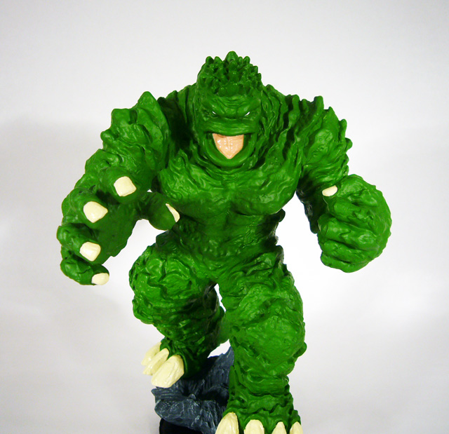 If you’ve seen any photos of the Mole Monster you’ll know that it has a really cool sculpt that brings to life the odd texture of the beast from those old Fantastic Four comics. There’s tremendous variation across its body from the fleshy bulk of its chest to the clearly defined plates and layers on its back. The lack of human-like musculature makes Giganto’s powerful limbs resemble flowing mud, especially where the arms end in one huge balled fist and one grasping hand (both complete with thick fingernails). The claws on its feet have great texture that captures the look of thick, unevenly grown calcium deposits. Beyond the figure itself, Giganto stands on a very intricate base of smashed rock. While the Mole Monster has a great sculpt, the paint job, while good and certainly accurate, doesn’t really go a long way to emphasize it. When the creature first appeared way back in the 60s it was depicted in pretty uniform green, and so that’s how it looks here. Giganto is one shade of rich green, with the only colors breaking it up the pink of its tongue and the yellowish-white of his nails, talons, and eyes. The gray rock base with white accents also helps to add a little more color to the sea of green.