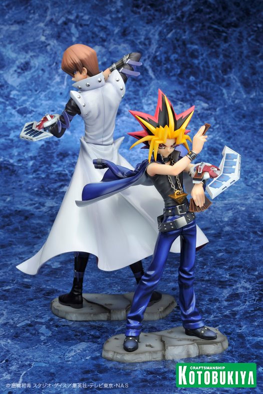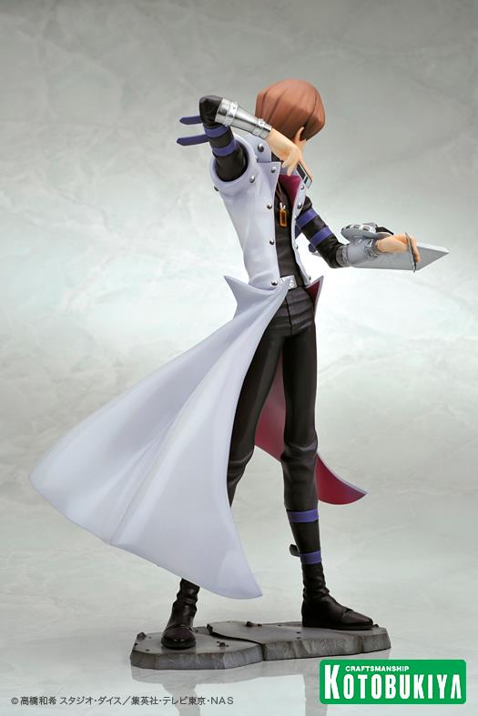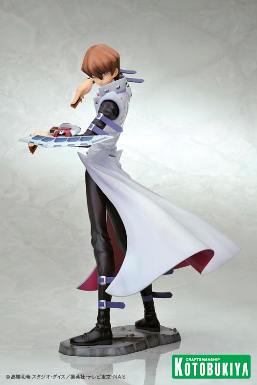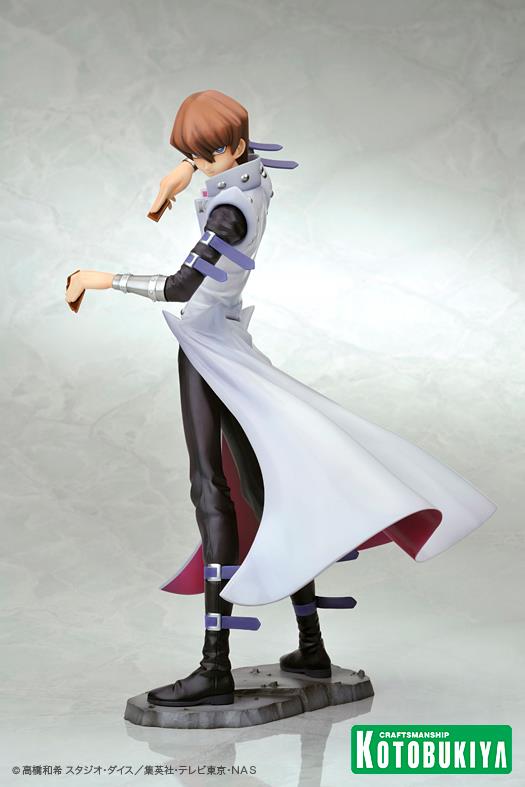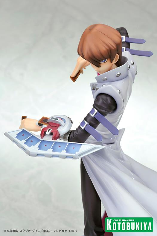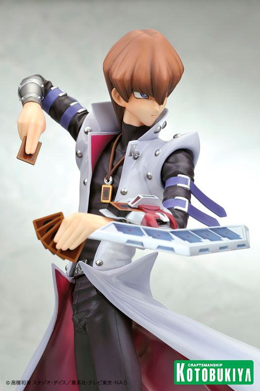 Wearing his iconic reflective silver-gray jacket with crimson interior and black clothing beneath it, Kaiba can be displayed with or without his removable arm-mounted card duel disk. Sculpted by Tsukuru Shirahige, Kaiba stands nearly 11 inches tall (1/7 scale) on a special worn terrain base.