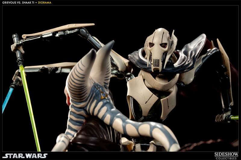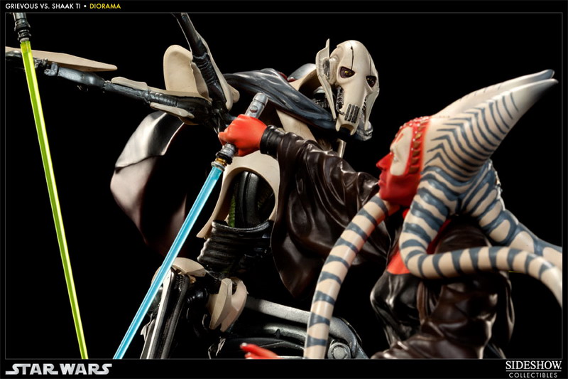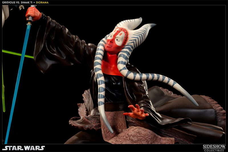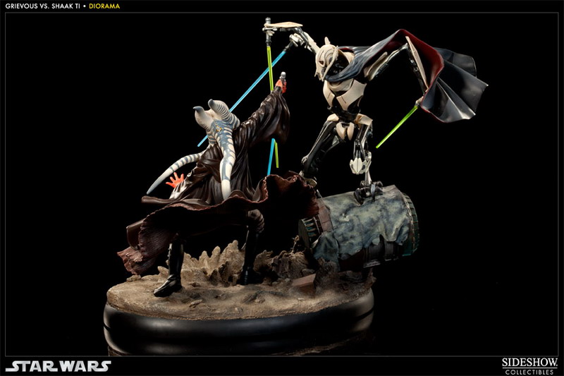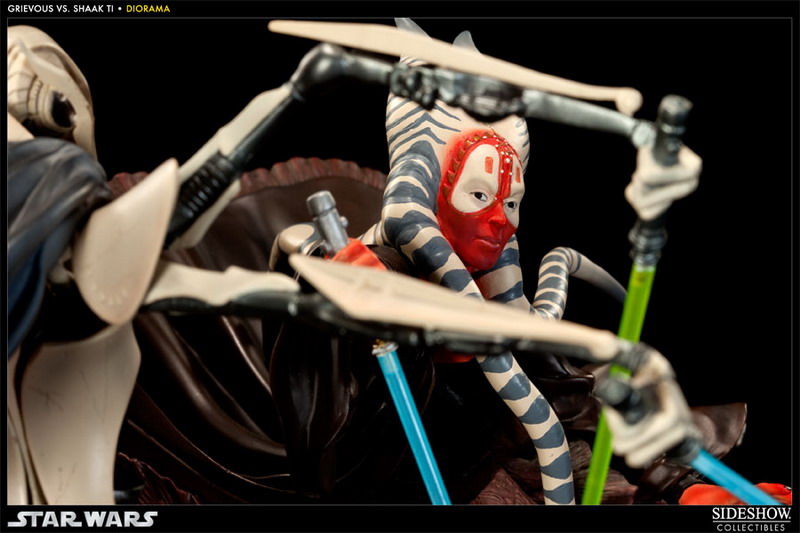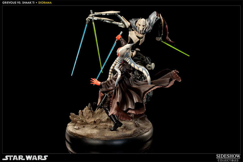 Sideshow provides photography revealing their latest Star Wars statue, a dynamic diorama of Shaak Ti fighting General Grievous called "Hunt for the Jedi". Pre-orders begin on Thursday, June 7th, 2012 the Shaak Ti VS General Grievous Diorama priced at $349.99.