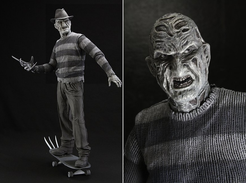 NECA keeps the San Diego Comic-Con exclusive reveals coming, this time unveiling the Gloved One himself, Freddy Krueger. This black-and white version of the Dream Master is taken from A Nightmare on Elm Street 5: The Dream Child and recreates one of his most spectacular kills. In the scene, comic book geek Mark Gray gets sucked into Freddy's very own comic book nightmare. Mark fights back by turning himself into a comic superhero, The Phantom Prowler, but alas his powers are no match to Krueger's and Mark is turned into paper and sliced to shreds.