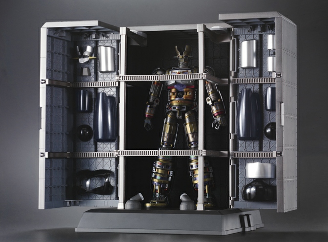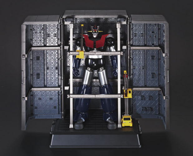 * A full hangar facility that contains the figure and its many components, for display or storage. "Hangar" contains LED footlights to illuminate Mazinger Z. Both a standard and rail-mounted crane are included.