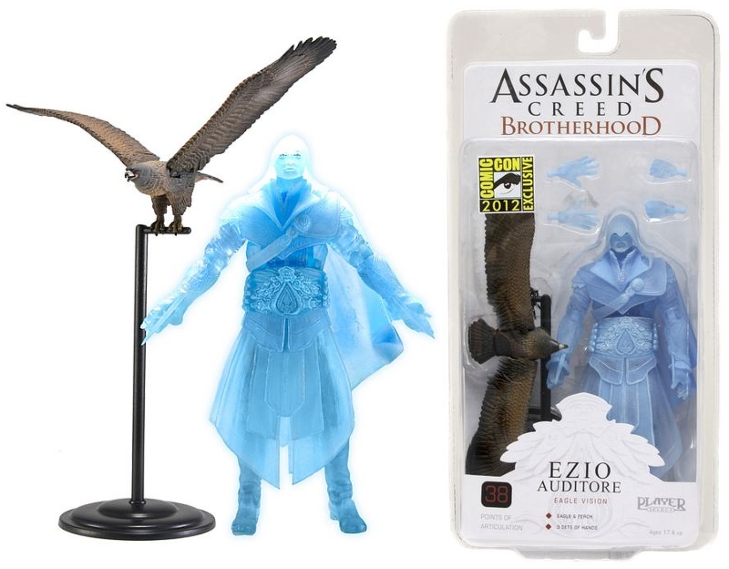The Eagle Vision refers to Ezio's sixth sense and one of the most helpful characteristics in the Assassin’s Creed series. Eagle Vision, passed down from an ancient line of assassins and interminably helpful in figuring out who’s a friend and who’s an enemy, gives people and objects a color-coded aura. Red is for enemies, blue for friends, gold for targets who may be able to help and white for information sources or hiding spots. This is reflected in the figure, Ezio being cast in a blue translucent plastic. Included is an Eagle with articulated wings and a perch to land on. Ezio himself has an astounding 38+ points of articulation and three sets of interchangeable hands.
