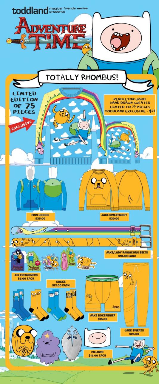First up, Adventure Time and the must-have item for any hardcore AT fan…a Pendleton Ward hand drawn designed sweater limited to only 75 pcs and sell for $75…this will not last! Awesome Finn and Jake Hoodies ($30 each), Jake and Lady Rainacorn Belts ($18), Jake and Finn Socks ($12), Jake Boxers ($15), Jake Sweats ($25), Assorted Air Fresheners ($5) and Assorted Pillows ($15).