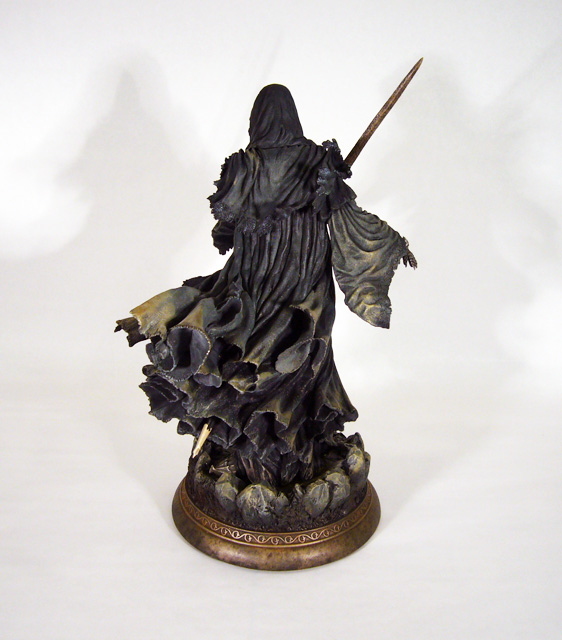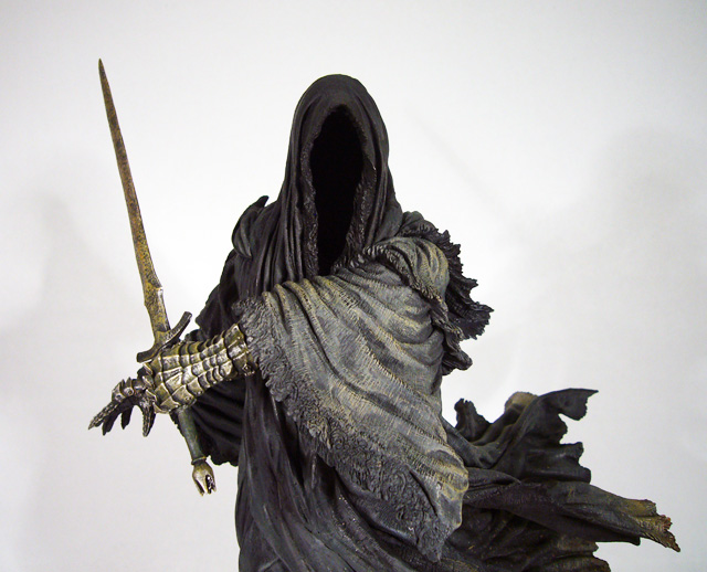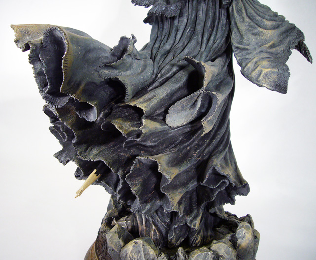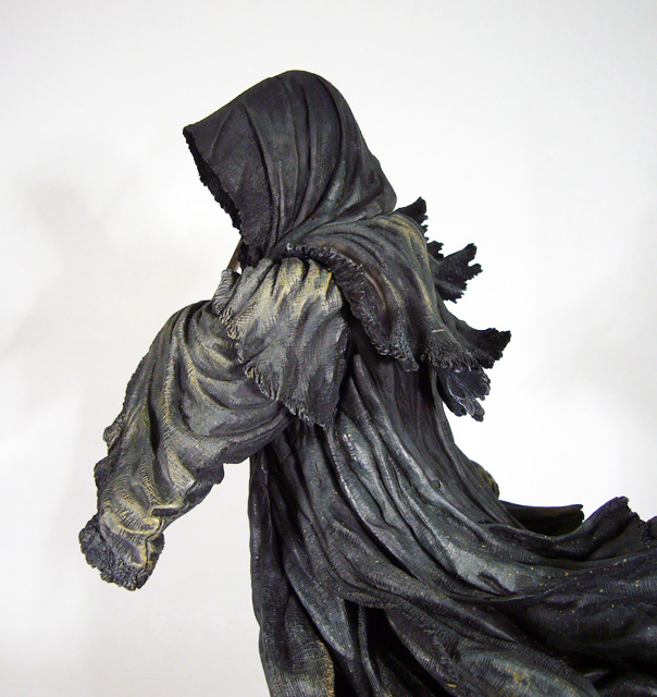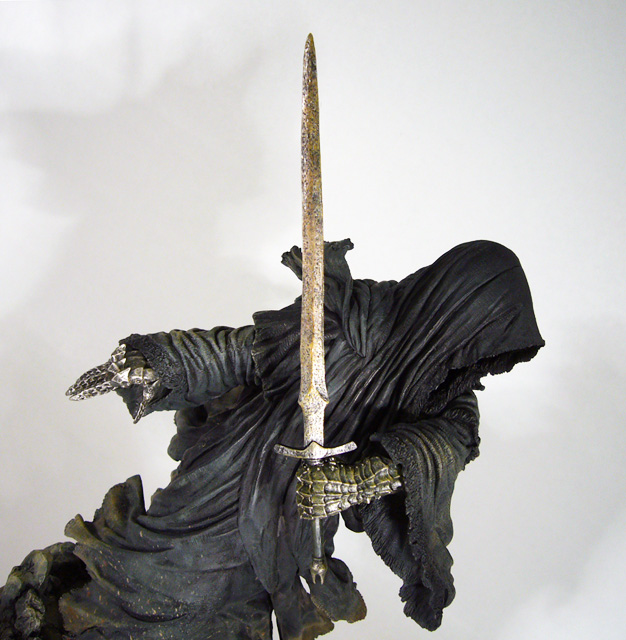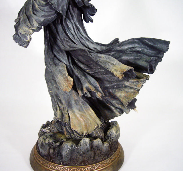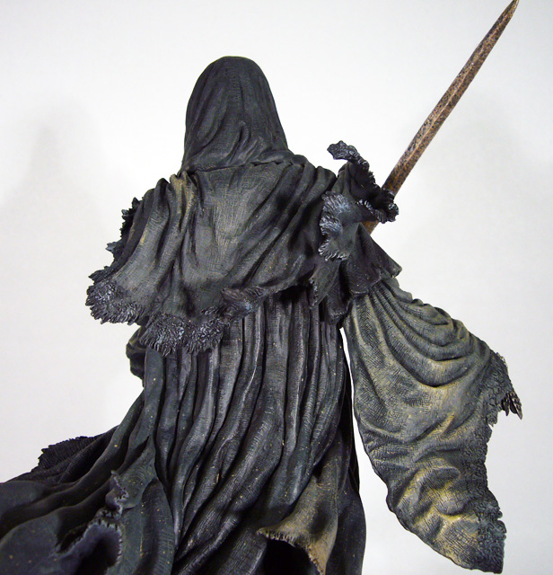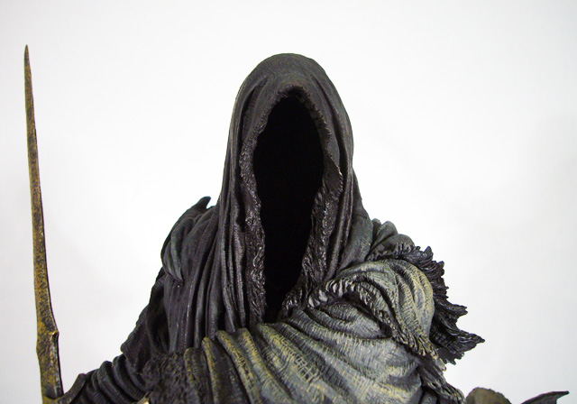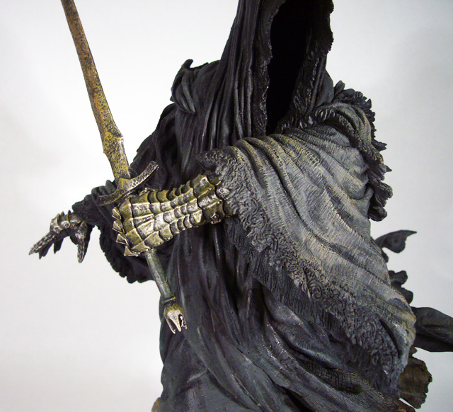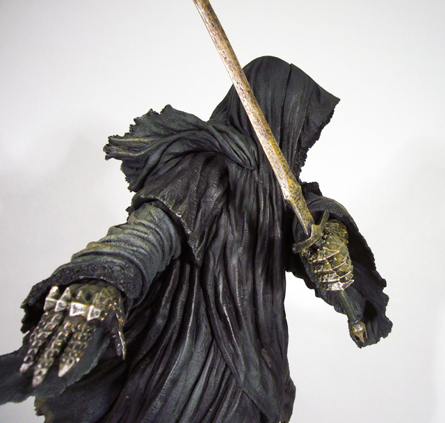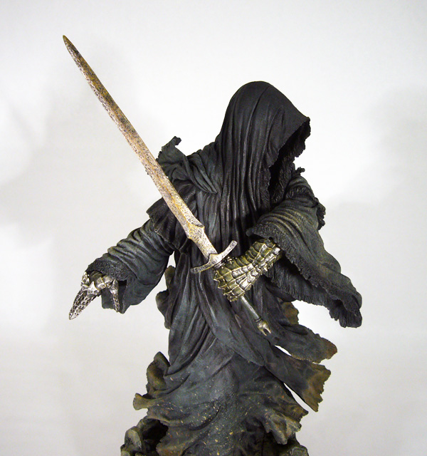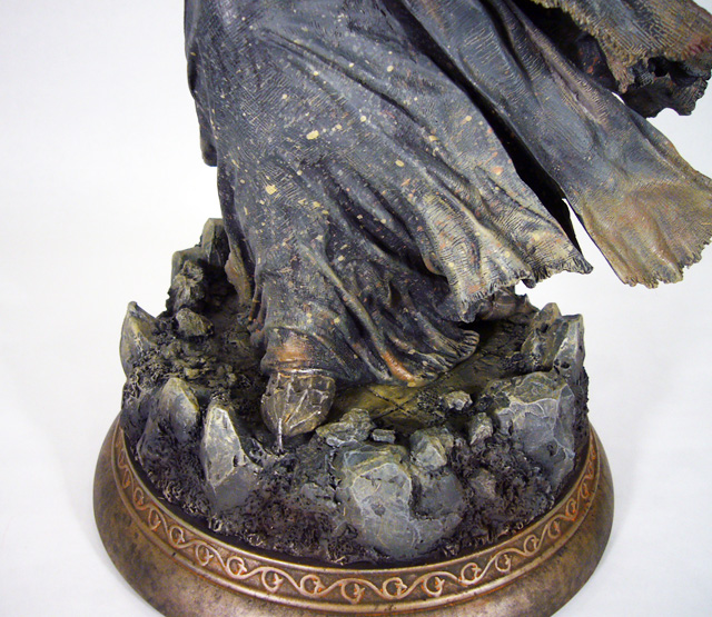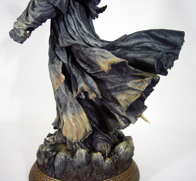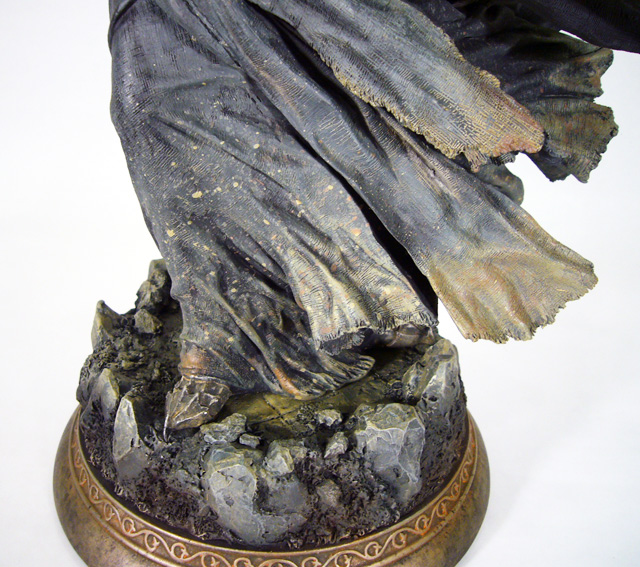 The Ringwraith’s sculpt is nothing short of fantastic. The statue is a foot and a half of crazy folded and billowing “fabric” with details like you wouldn’t believe. The robe has a great intricate texture to it, and at its edges it’s frayed and torn up from use and travel. The garment flows backward around the walking Ringwraith, highlighting his arms and foremost knee. The collar of the robe flaps around his back, while its trailing edge flows out behind him in a huge convoluted mass. The Ringwraith’s cowl is sculpted in an open hood; it’s so dark inside you just have to get a closer look to make sure there’s nothing in there (and there isn’t). Sticking out of the robe are heavily armored appendages; both the feet and hands are covered in segmented metal armor that has a weighty look contrasting with the lightness of the robe. The Ringwraith’s longsword is appropriately pitted and worn, and you can even see just the tip of his scabbard peeking out of the folds of his robe.
