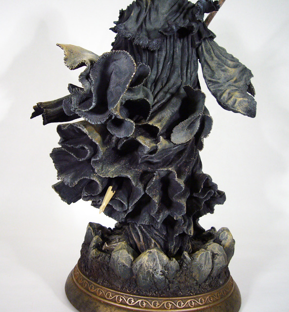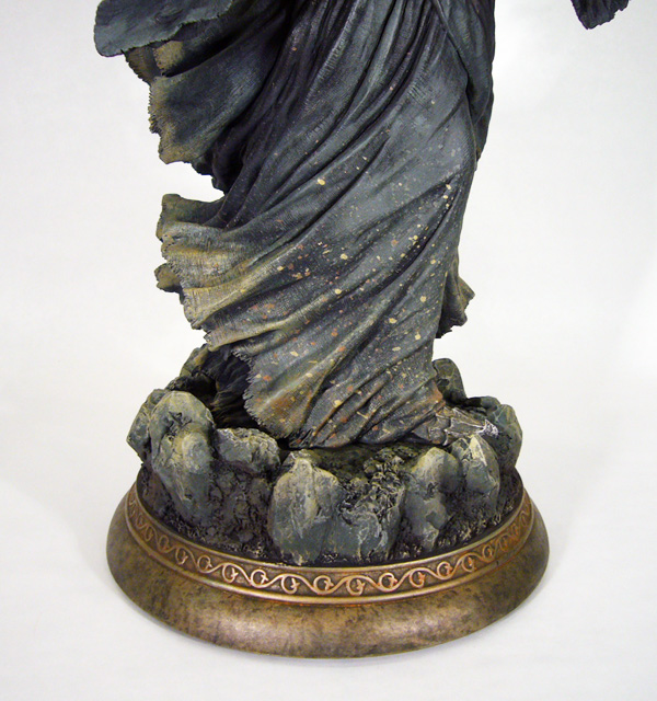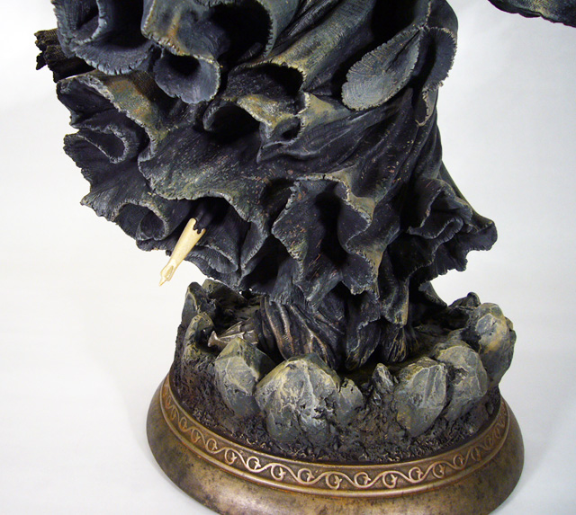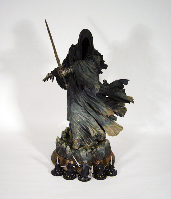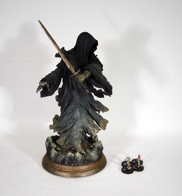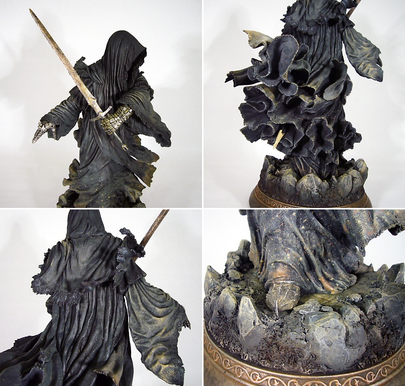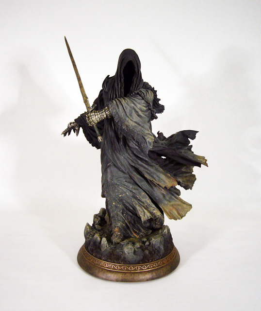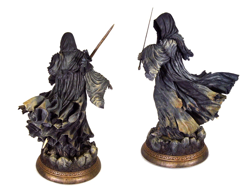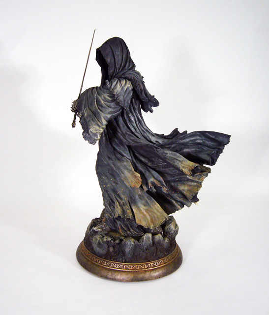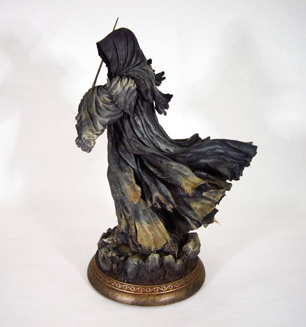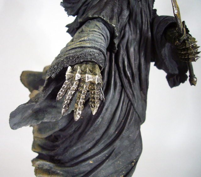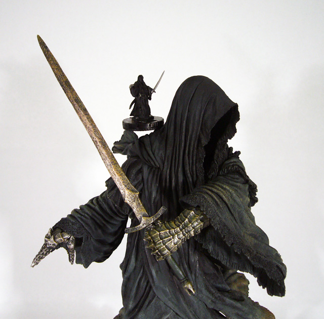 The Ringwraith’s sculpt is nothing short of fantastic. The statue is a foot and a half of crazy folded and billowing “fabric” with details like you wouldn’t believe. The robe has a great intricate texture to it, and at its edges it’s frayed and torn up from use and travel. The garment flows backward around the walking Ringwraith, highlighting his arms and foremost knee. The collar of the robe flaps around his back, while its trailing edge flows out behind him in a huge convoluted mass. The Ringwraith’s cowl is sculpted in an open hood; it’s so dark inside you just have to get a closer look to make sure there’s nothing in there (and there isn’t). Sticking out of the robe are heavily armored appendages; both the feet and hands are covered in segmented metal armor that has a weighty look contrasting with the lightness of the robe. The Ringwraith’s longsword is appropriately pitted and worn, and you can even see just the tip of his scabbard peeking out of the folds of his robe.