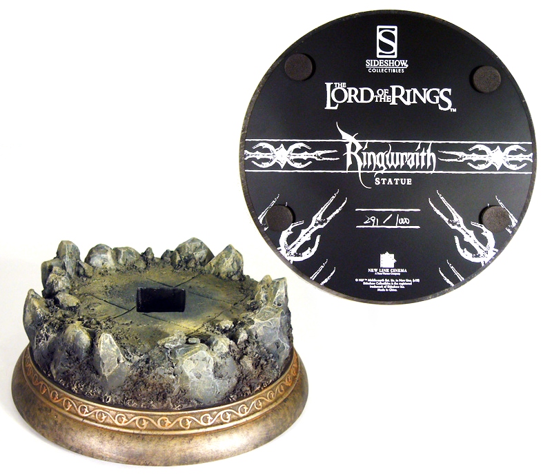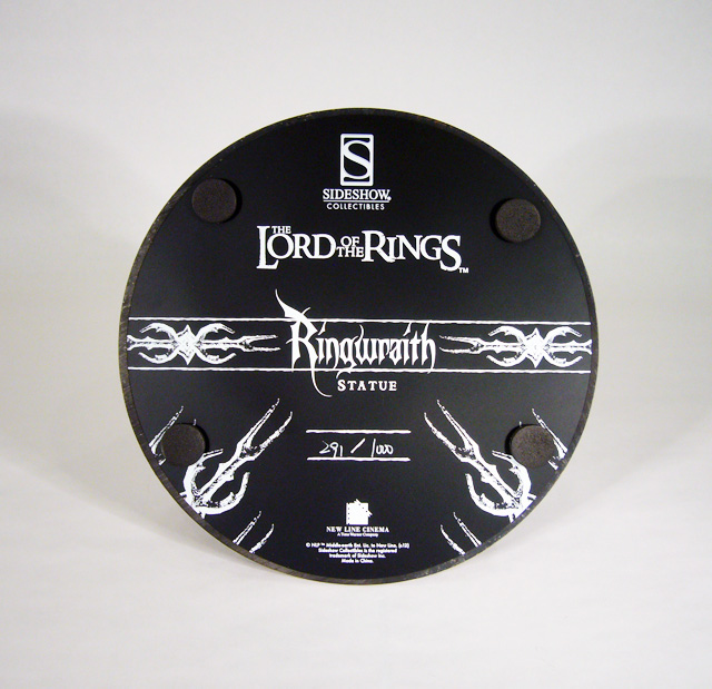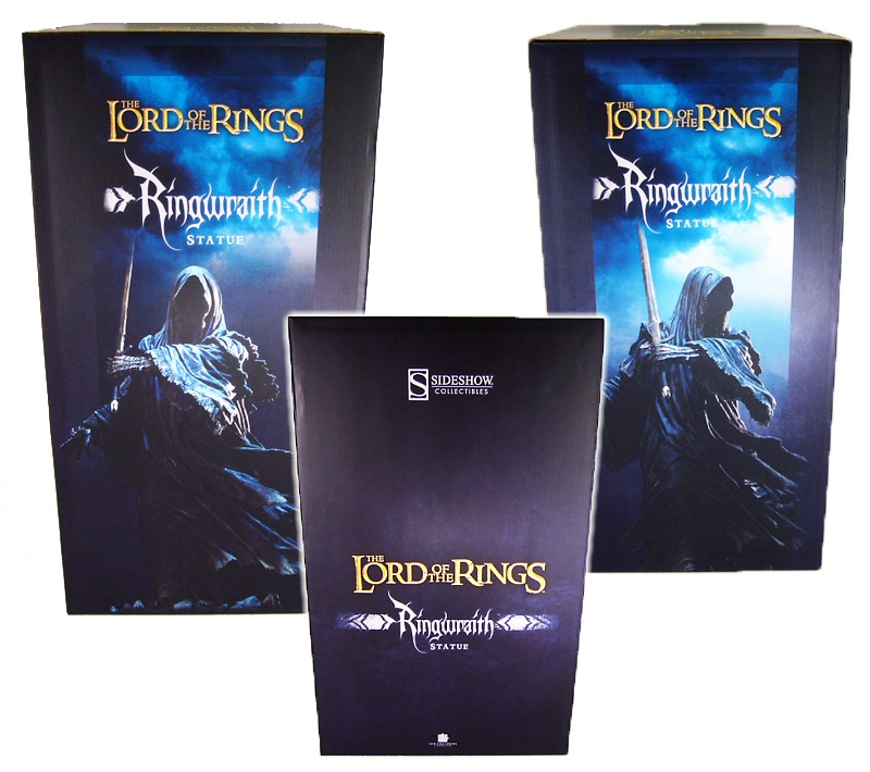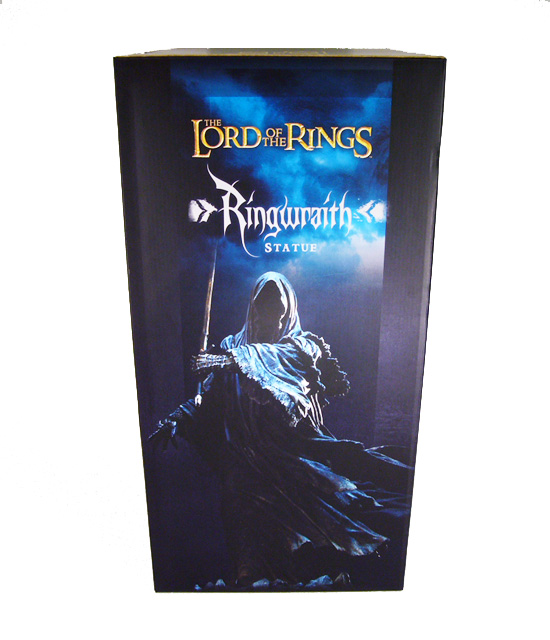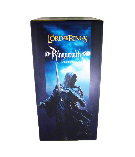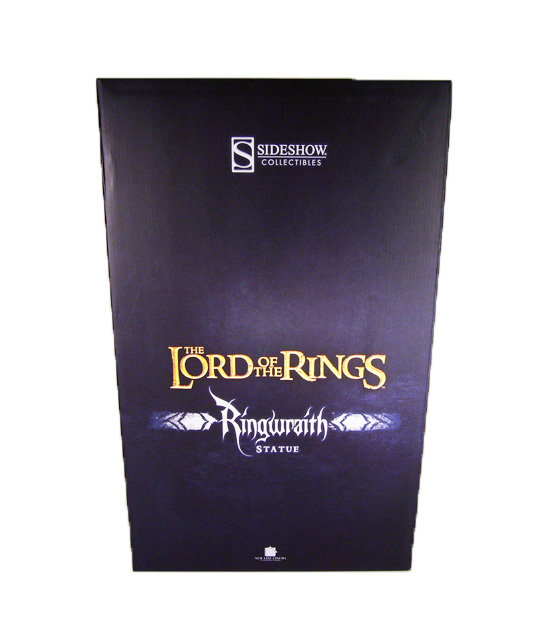 Sideshow Collectibles is known for its amazing array of statues, large-scale figures, and other high end products. Like many of those the Ringwraith comes packaged in a suave, sophisticated box that’s almost minimalist in design, black with crisp decoration. It’s also enormous, nearly two feet high, 12 inches wide, and 13 inches long. The front and back panels are identical, with four logos on a black space. At the top is Sideshow, followed by the Lord of the Rings movie title two-thirds of the way down. Immediately below that is the Ringwraith statue nameplate in a really cool font, and finally a tiny New Line Cinema logo at the very bottom. Each side of the box has movie title and character name along with a photo of the statue in cool mood lighting. Inside the box the statue is held securely in a massive styrofoam coffin with four easy to assemble parts.
