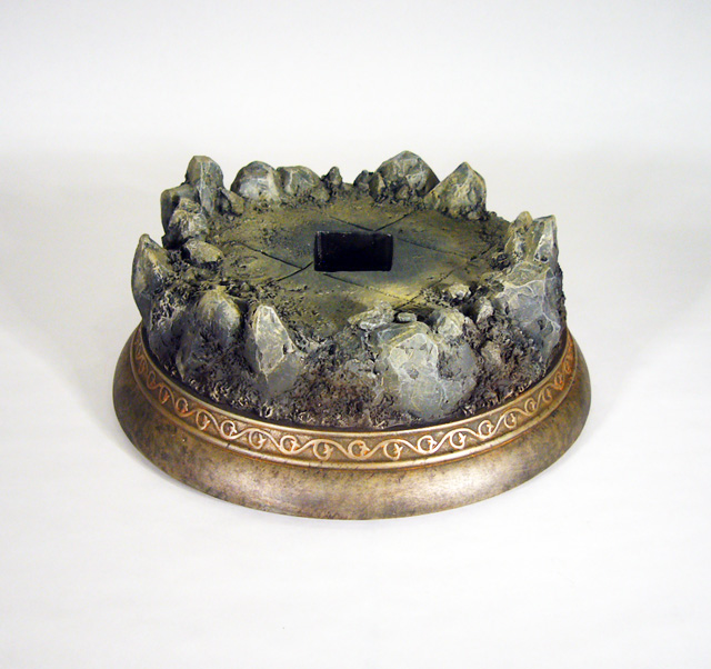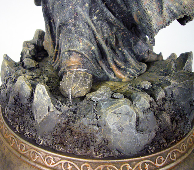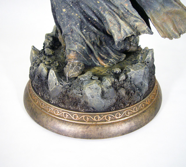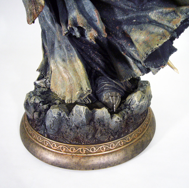 Even a great sculpt like this could have been lost in a bad paint job, but thankfully you don’t have to worry about that. While the Nazgul’s robes may once have been black, the endless questing from Mordor and back have stained them with a complex spattering of mud and other debris. In fact, the statue has a variegated paint job with lighter and darker patches that make it look like light is hitting it at different angles. Meanwhile, the “steel” of the Ringwraith’s armor and sword is a weathered metallic bronze color that further emphasizes the creature’s ageless evil. Finally, the Nazgul’s base is also intricately painted both on its terrain top and the metallic disc below it.