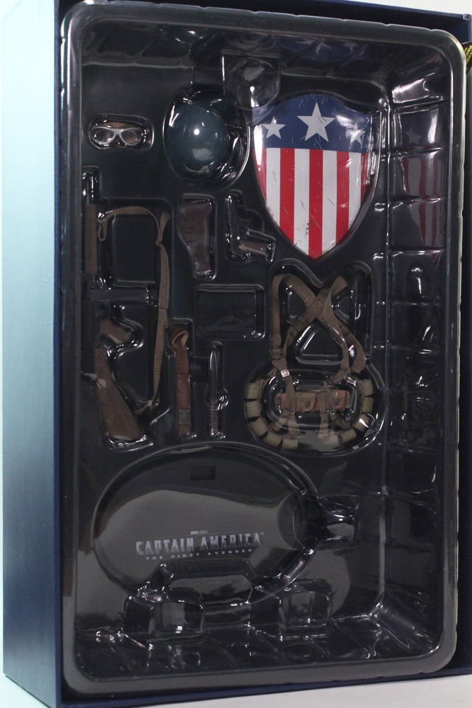 The box for Captain America is attractive indeed with vintage style art of the captain, weathered for the nostalgic look. The inner box slides out from the side and reveals the now standard method of separating the figure out from the accessories. My box did receive some wear and tear during shipping but if you order from Sideshow, they should be able to provide replacements.
