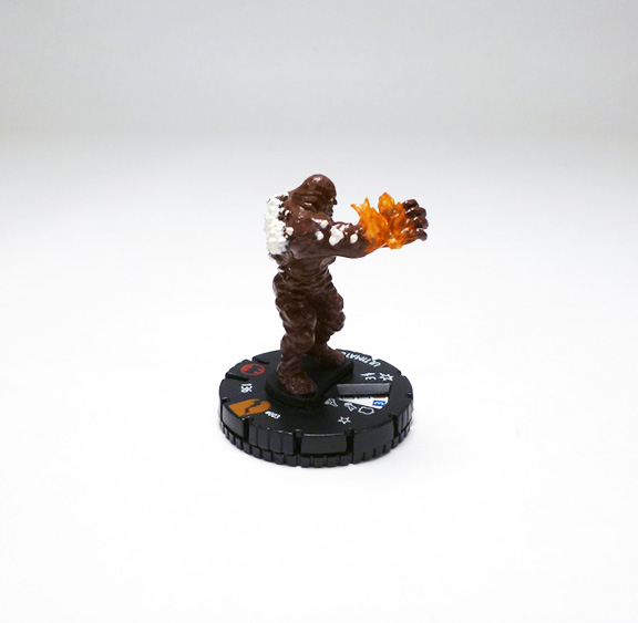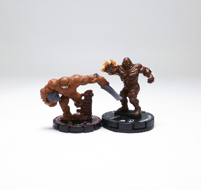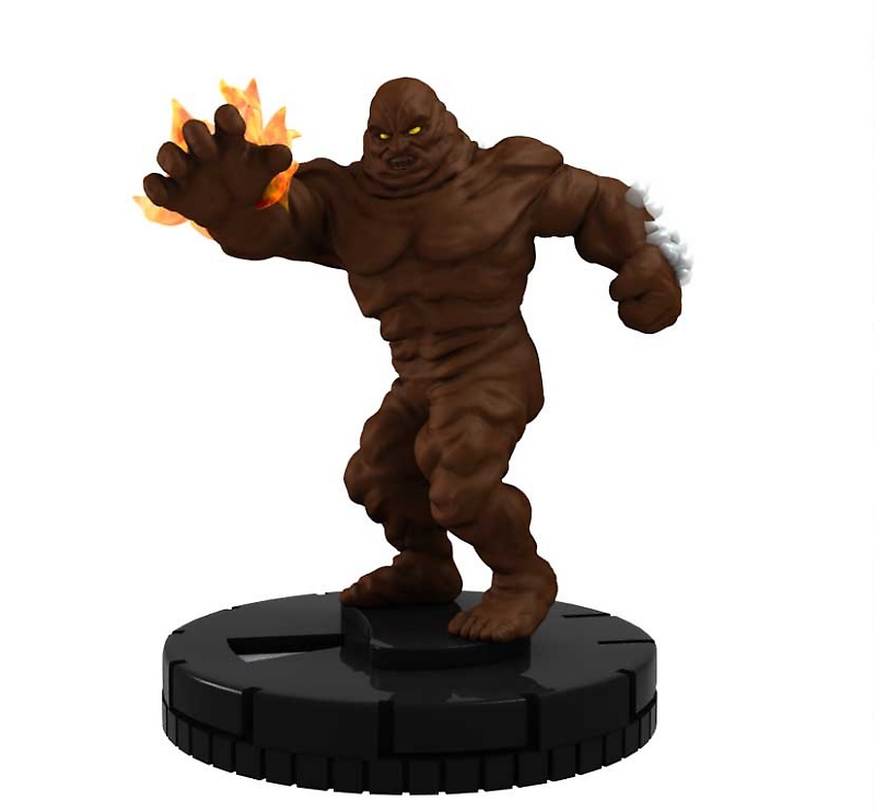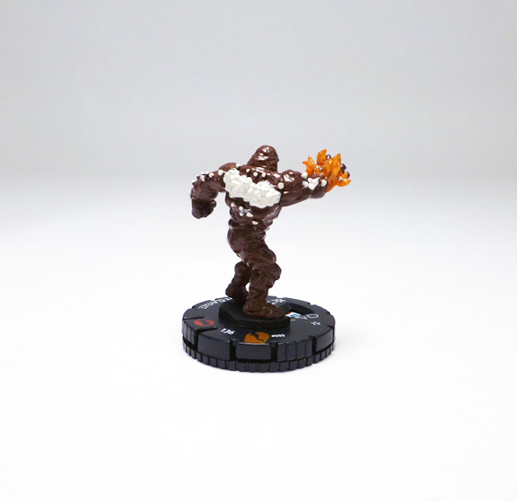 A couple of different Clayfaces have appeared in HeroClix before, but nothing like this powerhouse! Ultimate Clayface has the familiar shape of a humanoid made of dark brown mud with a huge upper body and relatively smaller legs. The villain twists at the waist, lunging forward to grab at the Dark Knight with his right hand while his left clenches into a fist behind him. Karlo features a gruesomely intricate sculpt of sloppy, flowing mud with a couple of specific aberrations. Across his back and left arm are white crystalline quartz structures while his right hand is wreathed in translucent orange flames, and his face has a mud-packed nose and open mouth with tiny sculpted teeth! Finally, in addition to the brown, white, and orange, Ultimate Clayface has creepy yellow eyes.