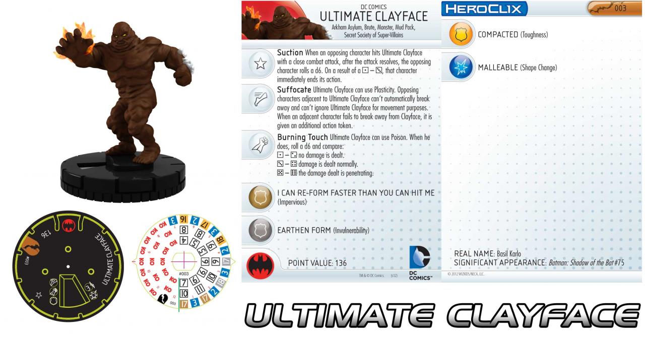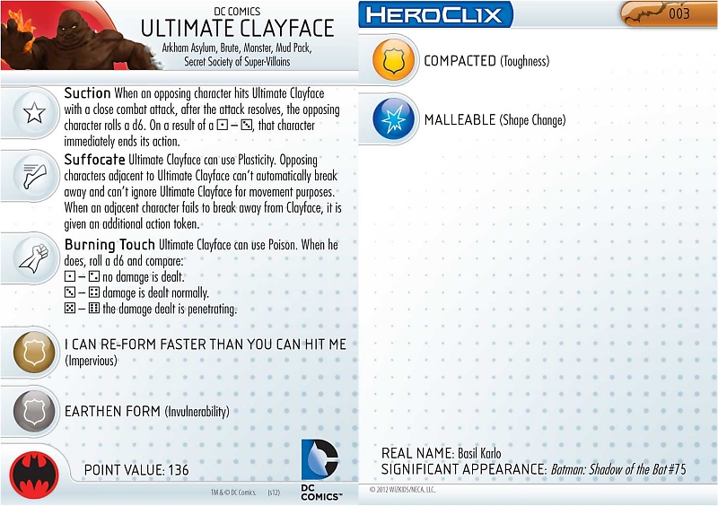 Ultimate Clayface has very good defense numbers and a typical succession of Impervious, Invulnerability, and Toughness (a damage reducer on every click). Finally, the muddy monster has alternating 3 and 2 damage with a full dial of Shape Change to avoid enemy attacks. In addition to all of his fun powers Ultimate Clayface even plays well with others with the keywords Arkham Asylum, Brute, Monster, Mud Pack, and Secret Society of Super-Villains.