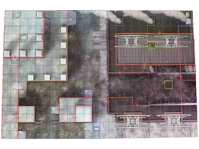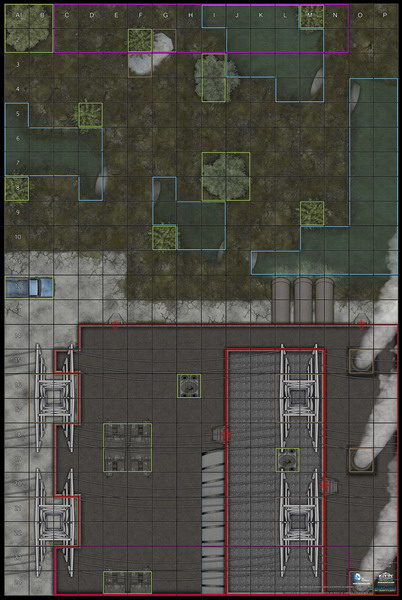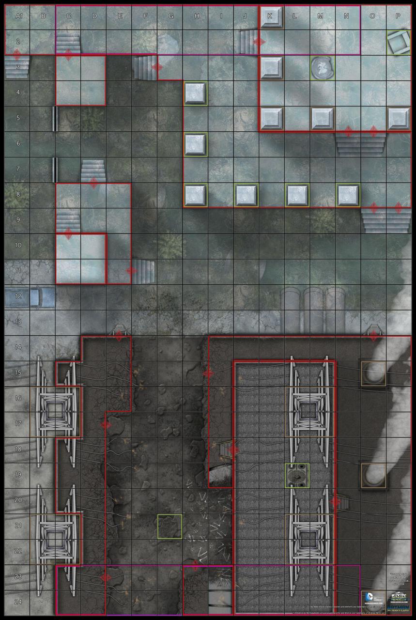 Should an earthquake occur during your match (a 3 or less on a 2d6 roll at the end of each player’s turn), flip the map to reveal Gotham City Power Plant: Post-Cataclysm! On the one side, a large portion of the power plant building has collapsed, leaving a different pattern of elevations - but surprisingly little hindering terrain. Meanwhile, Mr. Freeze has created an ice castle next door to oversee the operations (see Batman: Legends of the Dark Knight #121)! Another multi-storied structure, the castle has lots of stairs, several elevation 3 towers, columns for both hindering and blocking terrain, and a really look with icy surfaces. The cold and ice has even frozen the environs, blanketing everything in gray and eliminating the foliage and water terrain.