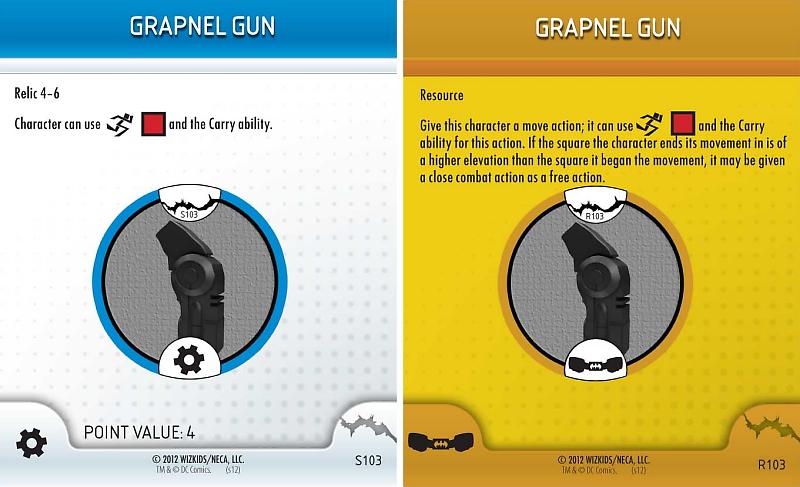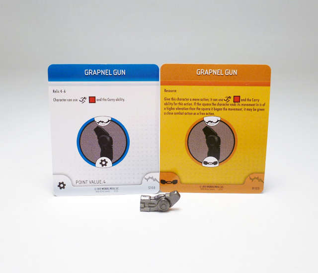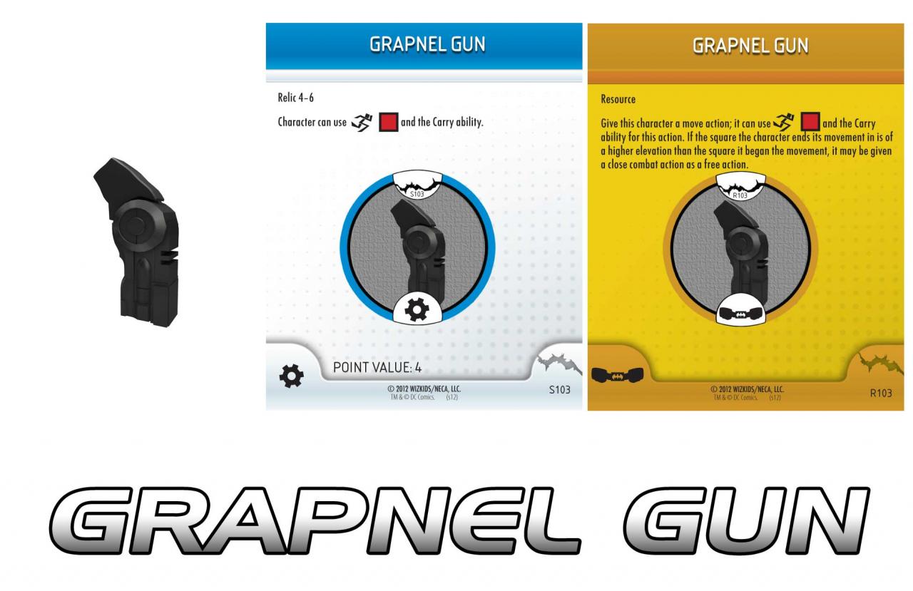 In the No Man’s Land tournament series, each month’s participation prize features an item you can attach to the Utility Belt resource dial. Month 3 brings the Batman’s number one tool for getting around Gotham City, the Grapnel Gun! The 3D object is a miniature gun with a nicely intricate sculpt that can be placed on the field of battle to be used as a Relic or attached to the belt. As a standalone object the Grapnel can be picked up on a roll of 4-6 and grants a character Improved Movement: Ignores Elevated Terrain and the Carry ability! Attached to the Utility Belt and used as a Resource it supercharges a character’s movement. Whenever it is given a move action it can use Improved Movement: Ignores Elevated Terrain and the Carry ability, and if ends its move on a higher elevation than where it began it may be given a close combat action as a free action.