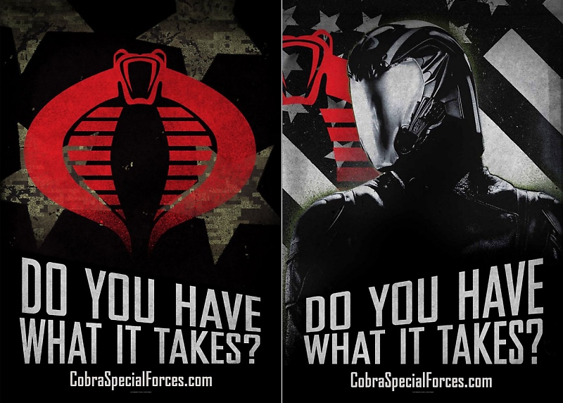 Do you have what it takes to become a member of Cobra Specila Forces? Paramount Pictures' latest Cobra-themed promotion for GI Joe: Retaliation asks that very question with some cool propaganda posters (above) and a slick recruitment video (below). I've always loved the look of Cobra over the Joe forces, so count me in. Coooobbbbbrrraaaa!
