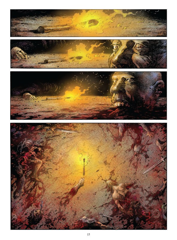 Led by the astute Templar Knight William of Sonnac, the war band includes the seditious alchemist Gautier of Puysegue, the fearless seneschal Ulrich of Syracuse, the female warrior Clotilde of Angers, and the brutal battle brother Robert Renfrew among others. Eventually joined by the Hand of Saint Peter and the Pope's personal assassin Jehu and the Mameluk General Ali Musafir, this oddly composed band finds themselves not only discovering the frightening reality of the demonic creatures, but evidence of extra-terrestrial interference in the war between religions. This of course leads to the Christians and Muslims compromising and working together to battle an unexplained and underestimated enemy the likes of which they'll never understand (below).