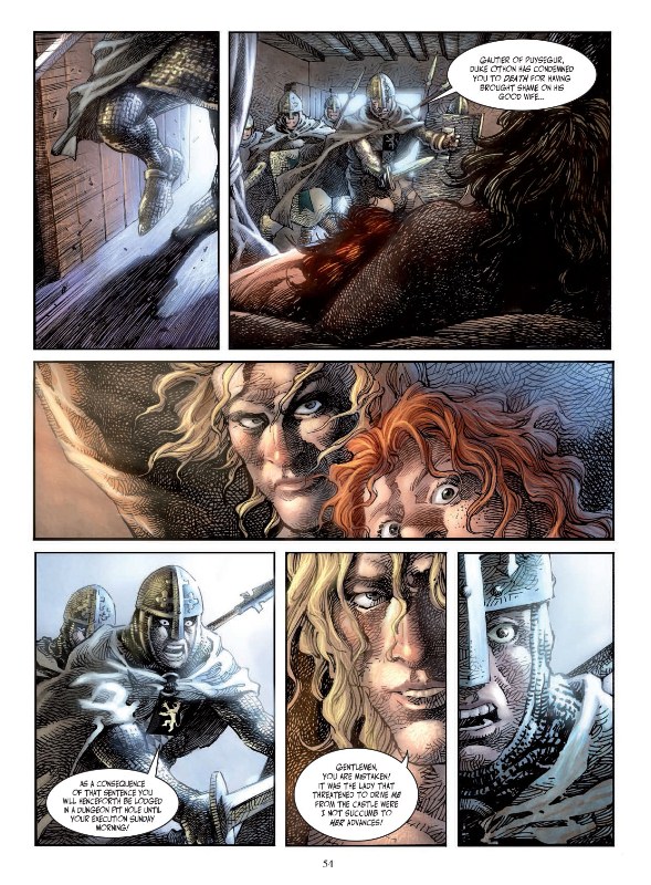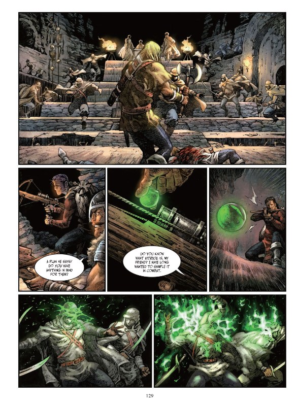 Along with impressive artwork, the page design and story layout is brilliant. Truly cinematic in scope, the use of 10 or more panels on a single page combined with the use of multiple double-page spreads gorgeously reveal the setting and characters while propelling the plot forward. Broken into three separate volumes; Vol 1 - The Silver-Eyed Specter, Vol 2 - The Door of Hermes and Vol 3 - The Battle of Mansoura; the book's central plot stays firm while each individual volume reveals separate themes and motivations, culminating in a postlude of sorts which readers will never see coming.