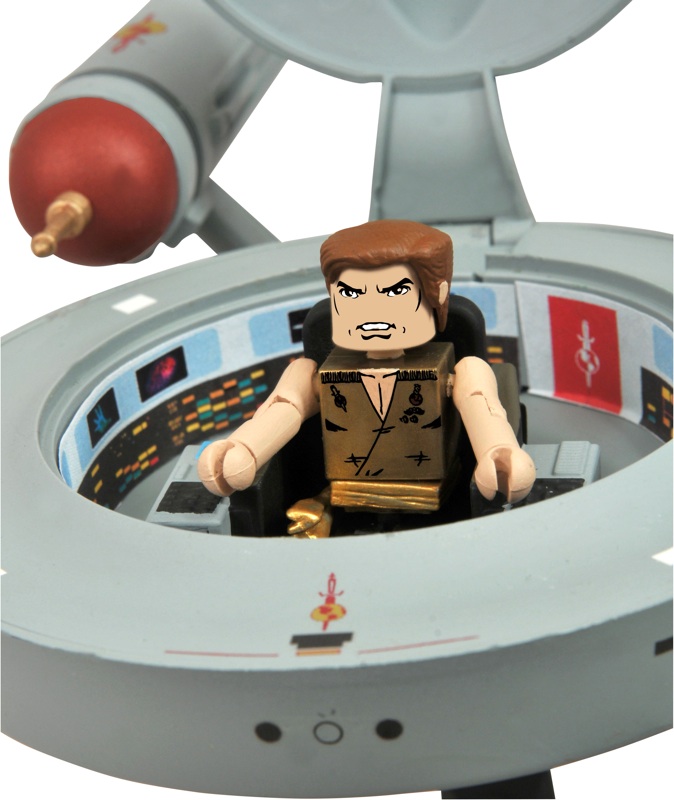 From the classic Star Trek episode “Mirror, Mirror,” it’s the I.S.S. Enterprise in Minimate form. In a mirror universe, the Enterprise and its crew are bloodthirsty representatives of a cruel civilization, and our universe’s Captain James T. Kirk must pose as his evil counterpart while finding a way back home. This Entertainment Earth exclusive version of the Minimate Enterprise features the distinctive “Terran Empire” markings and comes with Kirk in his sleeveless gold tunic. The Enterprise’s engineering section opens up to reveal a Jefferies Tube, and the bridge opens up to reveal the removable command chair.