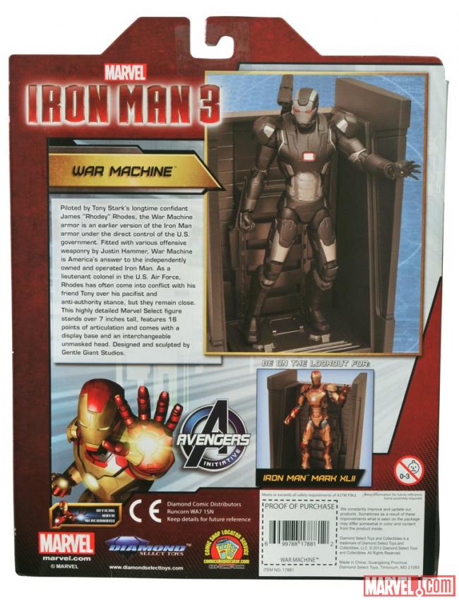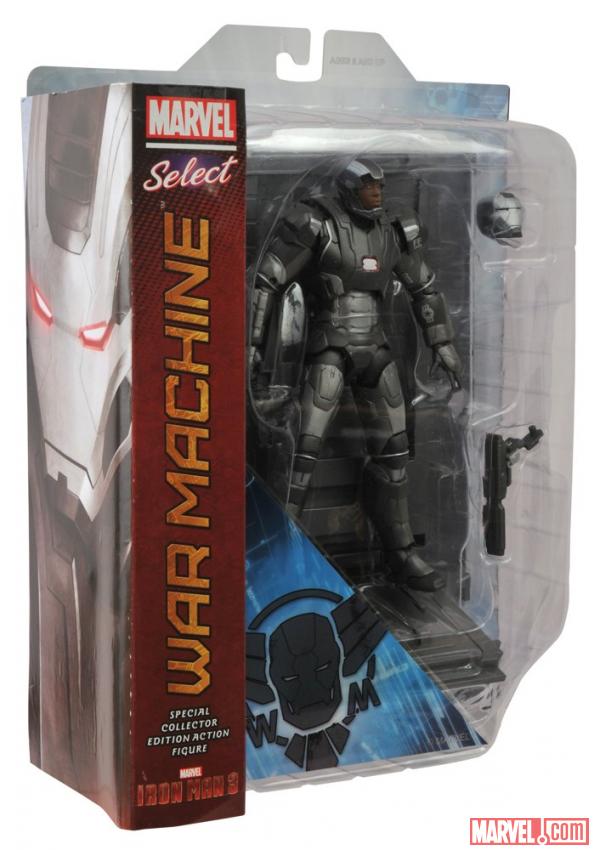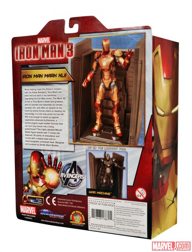 Marvel.com has posted new packaged photos of Diamond Select Toys' upcoming Iron Man 3 Marvel Select figure assortment. These include Iron Man Mark 42 and War Machine, both designed by Gentle Giant based on digital data from the film. Each figure stands approximately 7.5″ tall and features 16 points of articulation.