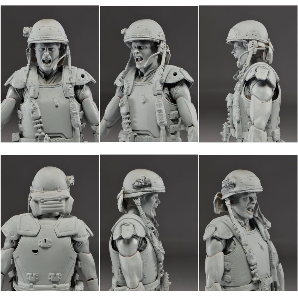 At the end of the Summer and into Fall, two Marines vs Aliens 2-packs will see release, each set pairing a Marine with a battle-damaged Alien Warrior (Blue, Exploding Head w/ Hicks; Brown, Torso Damage w/ Hudson). Hicks and Hudson in these sets will include additional accessories and star all-new head sculpts ("screaming" portraits with non-removable helmets - see pic HERE).