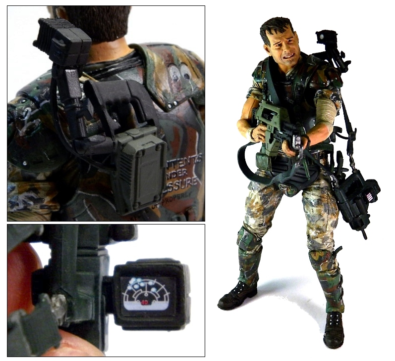 Hudson is no slouch either. In addition to his Pulse Rifle and torch, Hudson includes a TNR Shoulder Lamp attachment and hand-held motion tracker. The former simply plugs into his back armor, while the tracker can be gripped firm in Hudson's left hand or slung over his shoulder. The detail on the motion tracker is amazing, NECA zooming in and featuring a small screen with multiple targets zeroing in ("It's reading right man, look!"). Like Hicks, Hudson's armor comes adorned with tons of personalized graffiti including skull and crossbones, cartoon eyes, and the messages "Contents Under Pressure", "Dispose of Properly" and "Louise". He even has the sardine can opener on his groin armor.