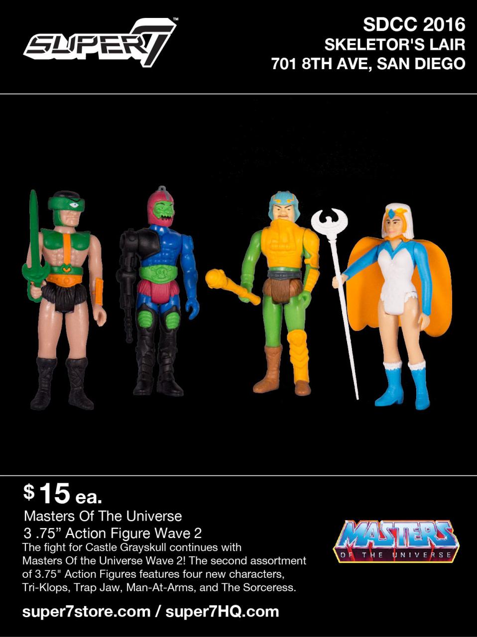 Super 7's second assortment of M.O.T.U. 3.75" Action Figures are making their debut at San Diego Comic-Con 2016. The 2nd wave of 3.75-inch Masters of the Universe action figures featuring Tri-Klops, Trap Jaw, Man-At-Arms, and The Sorceress will be available to purchase at Super 7's Skeletor's Lair pop-up shop.